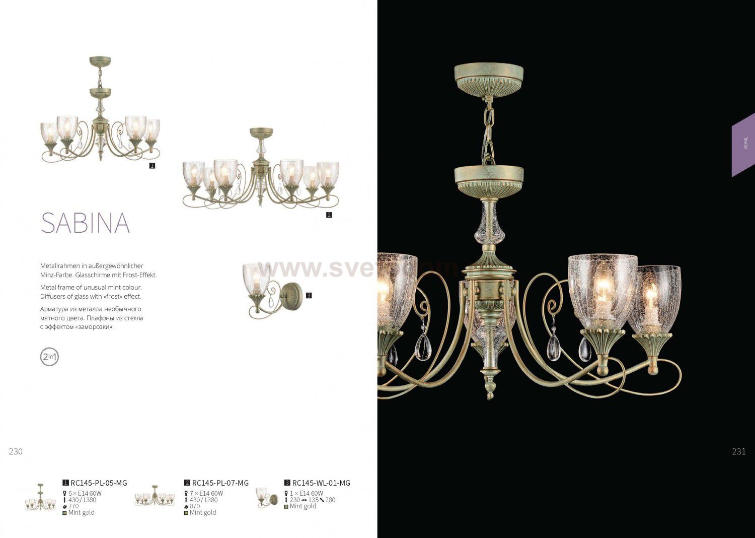 Особенности модели RC145-PL-07-MG: В серии Sabina использовано необычное цветовое решение: арматура выкрашена в золотистый цвет с мятной патиной. Это позволило подчеркнуть особенности декоративных элементов каркаса и придать серии индивидуальность. Плафоны светильников изготовлены из кракелированного стекла. На концах рожков закреплены подвески в форме капель. Универсальное крепление "2 в 1" позволяет монтировать люстры с использованием цепи или без нее. |