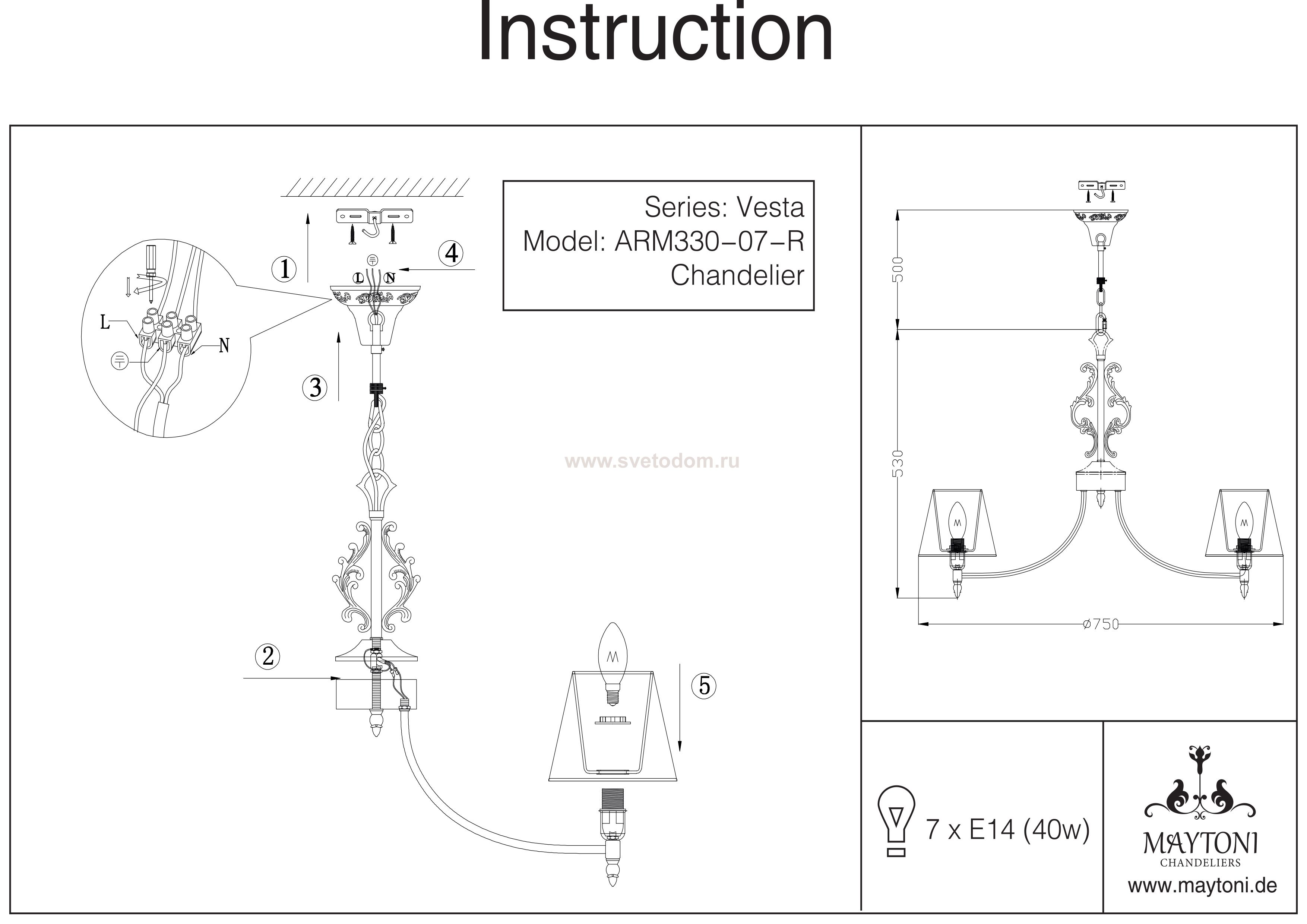 Массивная подвесная люстра представлена в коллекции Elegant известного во всем мире бренда Майтони. Ее изображение представлено на фото, изучив которое вы заметите, что подвесная люстра Maytoni Elegant RC330-PL-07-R состоит из бронзовых металлических рожков, отличающихся классической формой, семи традиционных текстильных плафонов и двух кованых фигур, украшающих подвес прибора. Совершая данную покупку, не забудьте о том, что компания-производитель, Maytoni, не включила стоимость лампочек в цену комплекта. Это значит, что вам стоит дополнительно заказать семь лампочек с цоколем Е14. |
