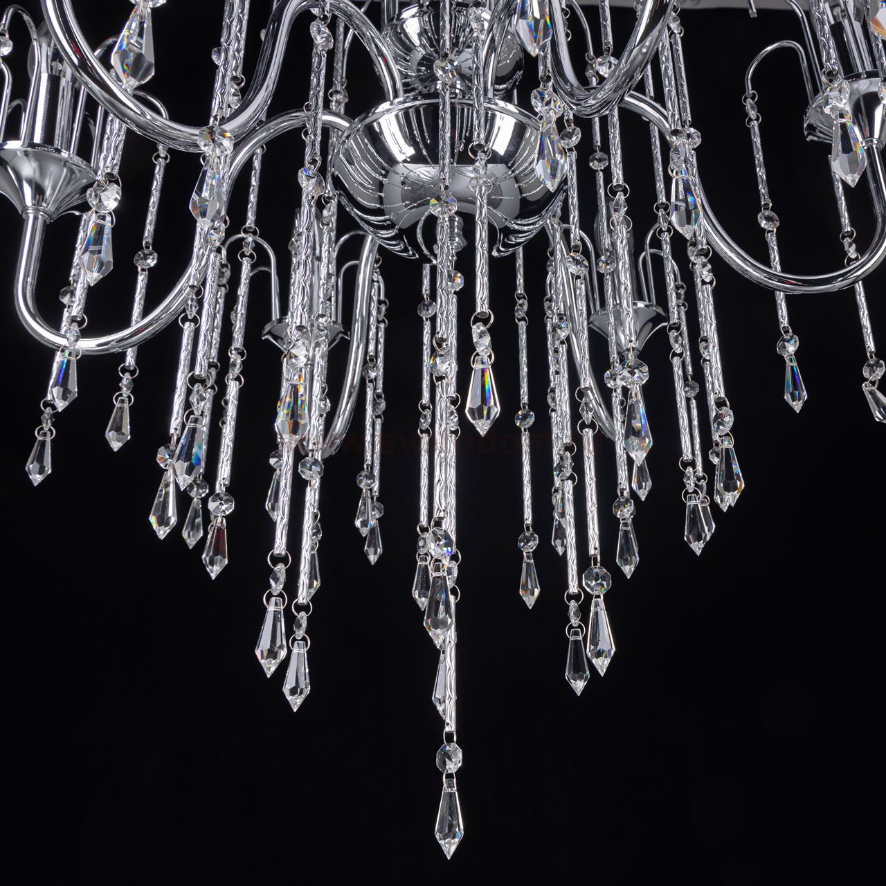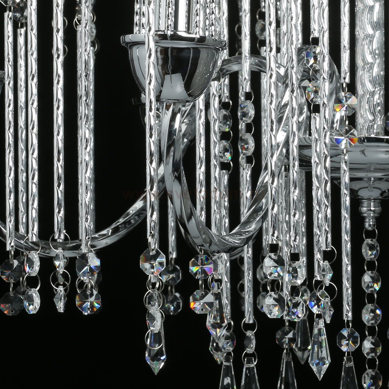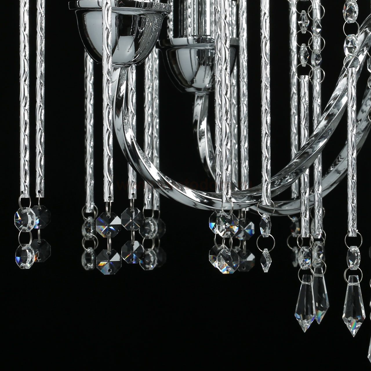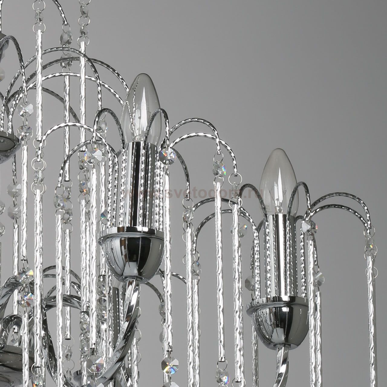 Металлическое основание светильника гальванизировано в цвет хрома. Витые рожки выполнены по технологии твист. Люстра декорирована прозрачным хрусталем высокого качества и витыми элементами из сплава алюминия с лазерной насечкой. Комментарий