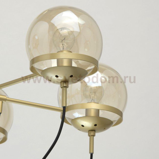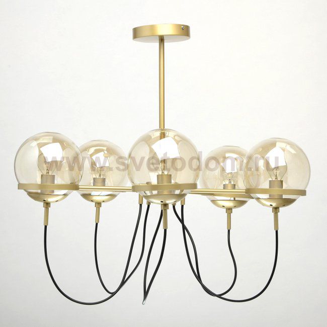 Оригинальный потолочный светильник выполнен в индустриальном духе и идеально подойдет для подсветки лофт-пространств. Минималистичное металлическое основание золотого оттенка подчеркнуто необычными сферичными плафонами из стекла цвета топаза. В качестве декоративного элемента выступают черные шнуры – простое и, вместе с тем, эффектное решение, которое придает композиции завершенность и еще раз напоминает о брутальном лофте, и практическом отсутствии декора