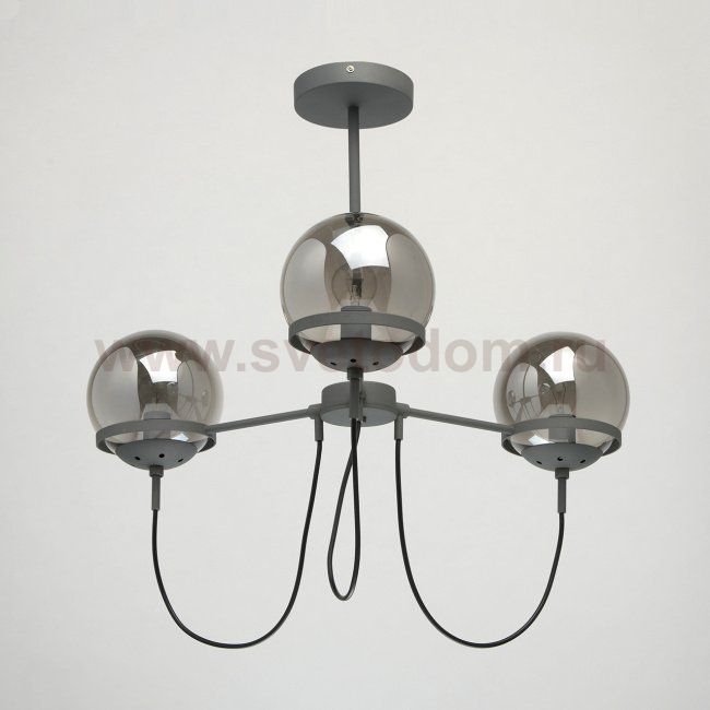 Трендовая цветовая палитра и индустриальный дизайн делают эту люстру одним из самых стильных решений для подсветки современных интерьеров, в особенности – лофт-пространств. Основание светильника выполнено из металла серого оттенка и дополнено сферичными стеклянными плафонами дымчатого цвета. Завершают композицию контрастные декоративные шнуры чёрного оттенка. Несмотря на кажущуюся простоту, модель выглядит очень эффектно.