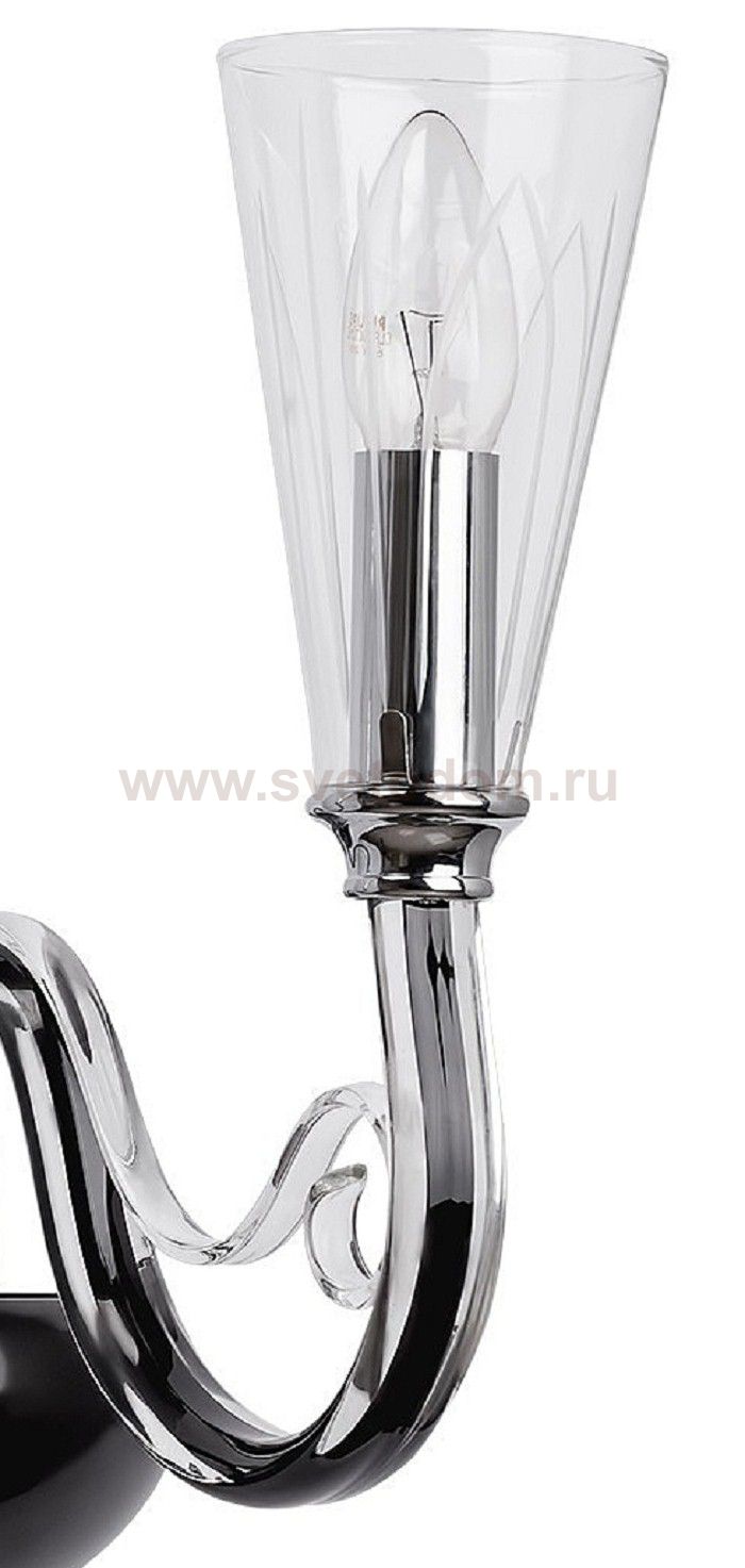 Описание модели 483020902: Помещение в стиле классика или неоклассика достойно светильника из коллекции Элла! Он демонстрирует оригинальность формы и декора. Бра Элла хороша для освещения зала, гостиной, холла в жилых и общественных помещениях, а также там, где необходимо подчеркнуть оригинальность и красоту интерьерного пространства. Металлическое хромированное основание декорировано крупными фигурными элементами из стекла, окрашенного в строгий чёрный цвет. Рожки в светильнике Элла имеют плавно-изогнутую форму, и каждый выполнен из двух дуг: одна окрашена изнутри в чёрный цвет, а другая - прозрачная с фигурным завитком. Плафоны конусовидной формы, расширенной к потолку, созданы творцами стекольного мастерства из прозрачного стекла и декорированы алмазной огранкой. Такая тонкость в оформлении плафонов светильника из коллекции Элла придаёт рассеивающемуся свету дополнительную игру и радужное свечение. Общая рекомендуемая площадь освещения для бра составляет 6 кв.м.