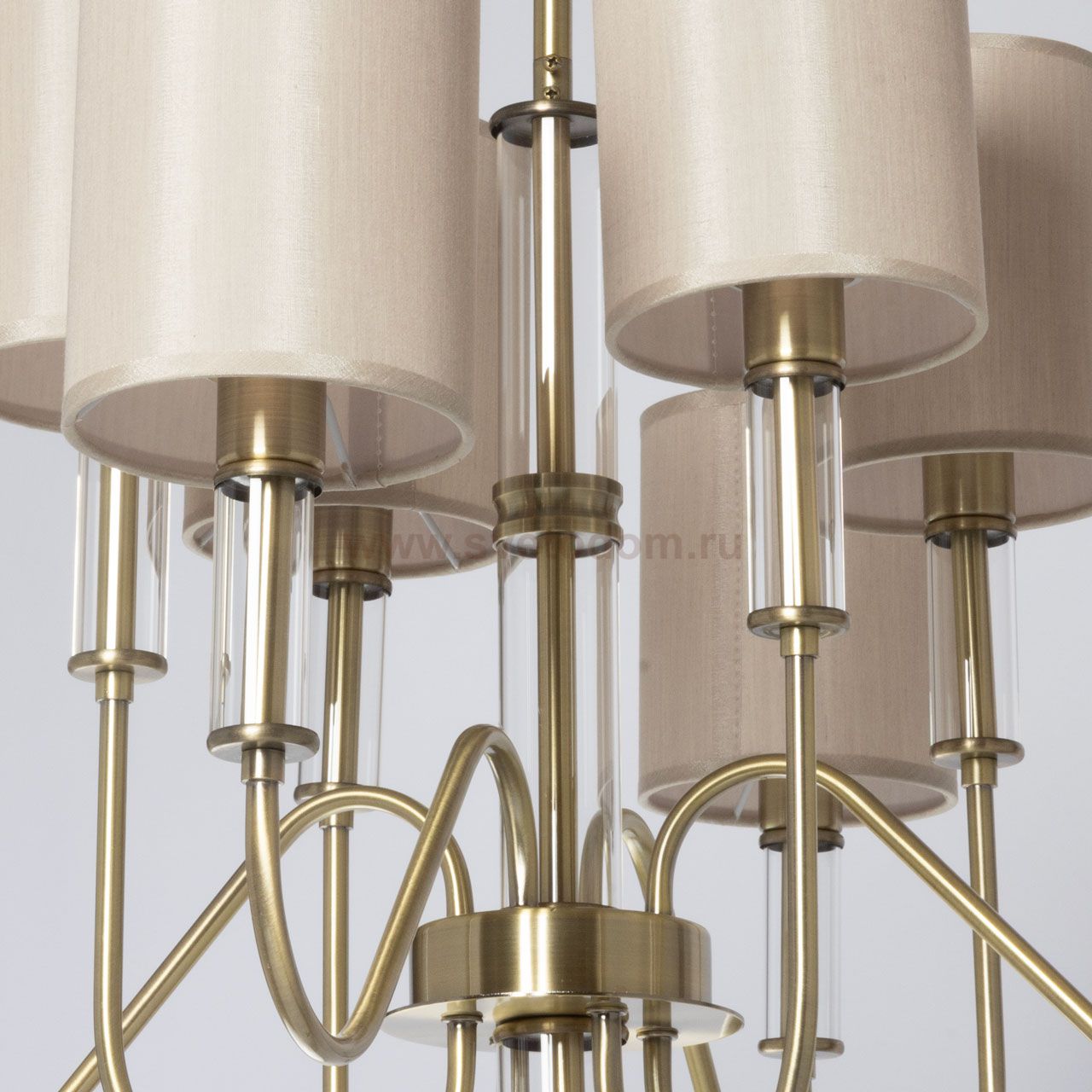 Металлическое основание подвесной люстры гальванизировано в цвет античной бронзы. Традиционные источники света закрыты двухслойными текстильными абажурами белого цвета с термостойким акрилом внутри. Абажуры отделаны кантами и прошиты. Светильник декорирован элементами из прозрачного стекла вытянутой формы. Комментарий