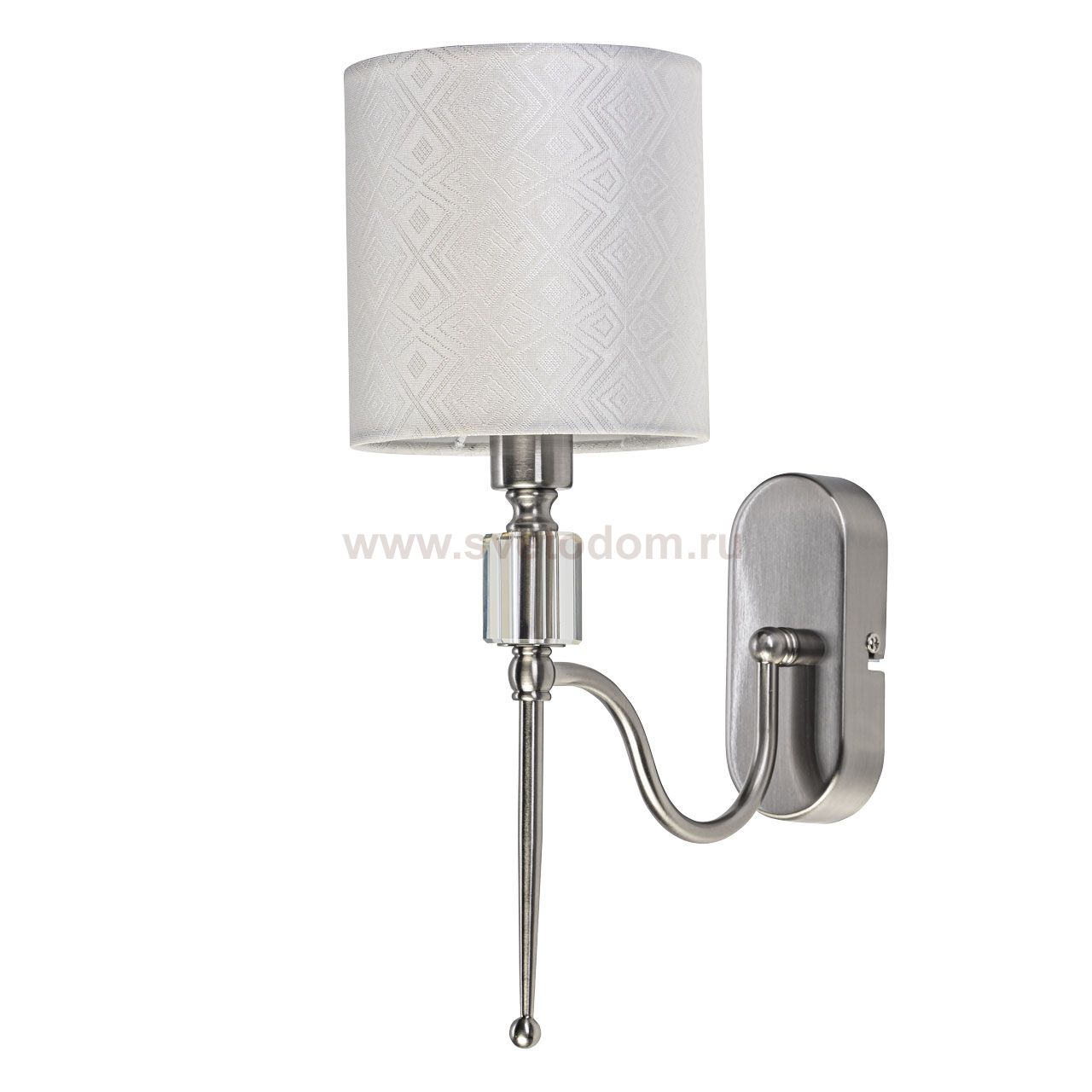 Металлическое основание настенного бра гальванизировано в цвет никеля, матировано. Двухслойный абажур белого цвета выполнен из текстиля и прозрачного термостойкого акрила. Бра декорировано прозрачным хрусталем. Комментарий