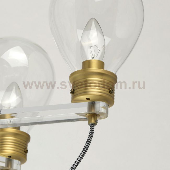 Основание светильника выполнено из металла и гальванизировано в цвет золота. Рожки выполнены из прозрачного акрила. Плафоны выполнены из прозрачного выдувного стекла. Светильник декорирован текстильным шнуром бело-черного цвета. Комментарий