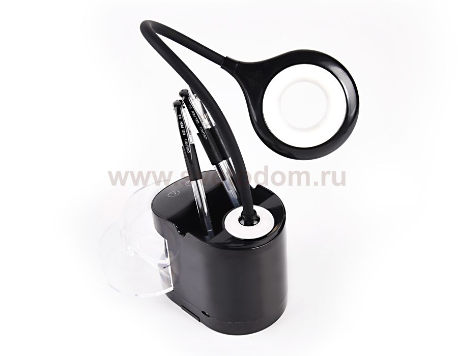 Светодиодная настольная лампа DE562 оформлена в современном стиле, черного цвета и выполнена по стандартам современных технологий. Данная модель оснащеня встроенной аккумуляторной батареей, USB портом, а так же органайзером и режимом диммирования, что создаст комфортное освещене для любого потребителя.