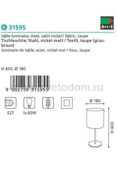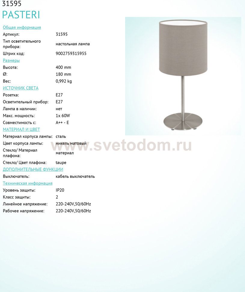 Настольная лампа – это не просто источник дополнительного освещения, но и оригинальный элемент декора. Его можно установить в спальне, гостиной, кабинете и других комнатах. Интернет-магазин «Светодом» предлагает настольные лампы разных стилей по доступным ценам. Благодаря большому ассортименту Вы обязательно найдете в нашем каталоге именно ту модель, которую искали. Настольная лампа Eglo 31595 – прекрасный вариант для завершения интерьера. Ее можно включить одновременно с люстрой для более яркого освещения или без нее для создания уютной атмосферы, настраивающей на отдых. Купить настольную лампу Eglo 31595 Вы можете с помощью виртуальной «Корзины» или по контактным номерам, указанным на сайте.