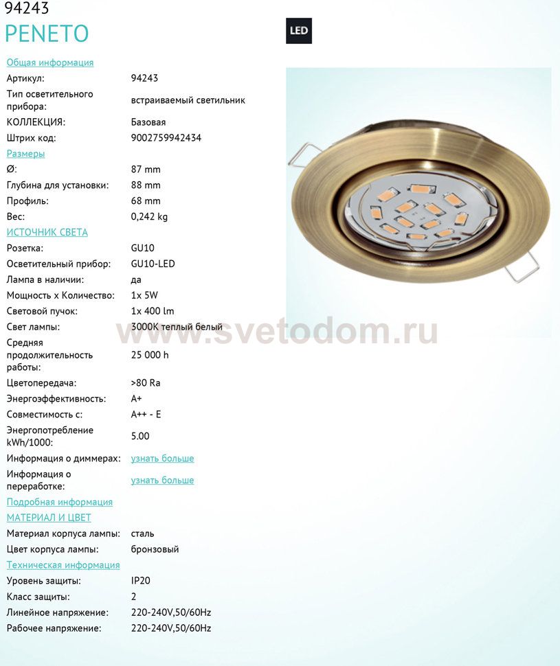 Встраиваемые светильники – популярное осветительное оборудование, которое можно использовать в качестве основного источника или в дополнение к люстре. Они позволяют создать нужную атмосферу атмосферу и привнести в интерьер уют и комфорт. Интернет-магазин «Светодом» предлагает стильный встраиваемый светильник Eglo 94243. Данная модель достаточно универсальна, поэтому подойдет практически под любой интерьер. Перед покупкой не забудьте ознакомиться с техническими параметрами, чтобы узнать тип цоколя, площадь освещения и другие важные характеристики. Приобрести встраиваемый светильник Eglo 94243 в нашем онлайн-магазине Вы можете либо с помощью «Корзины», либо по контактным номерам. Мы развозим заказы по Москве, Екатеринбургу и остальным российским городам.