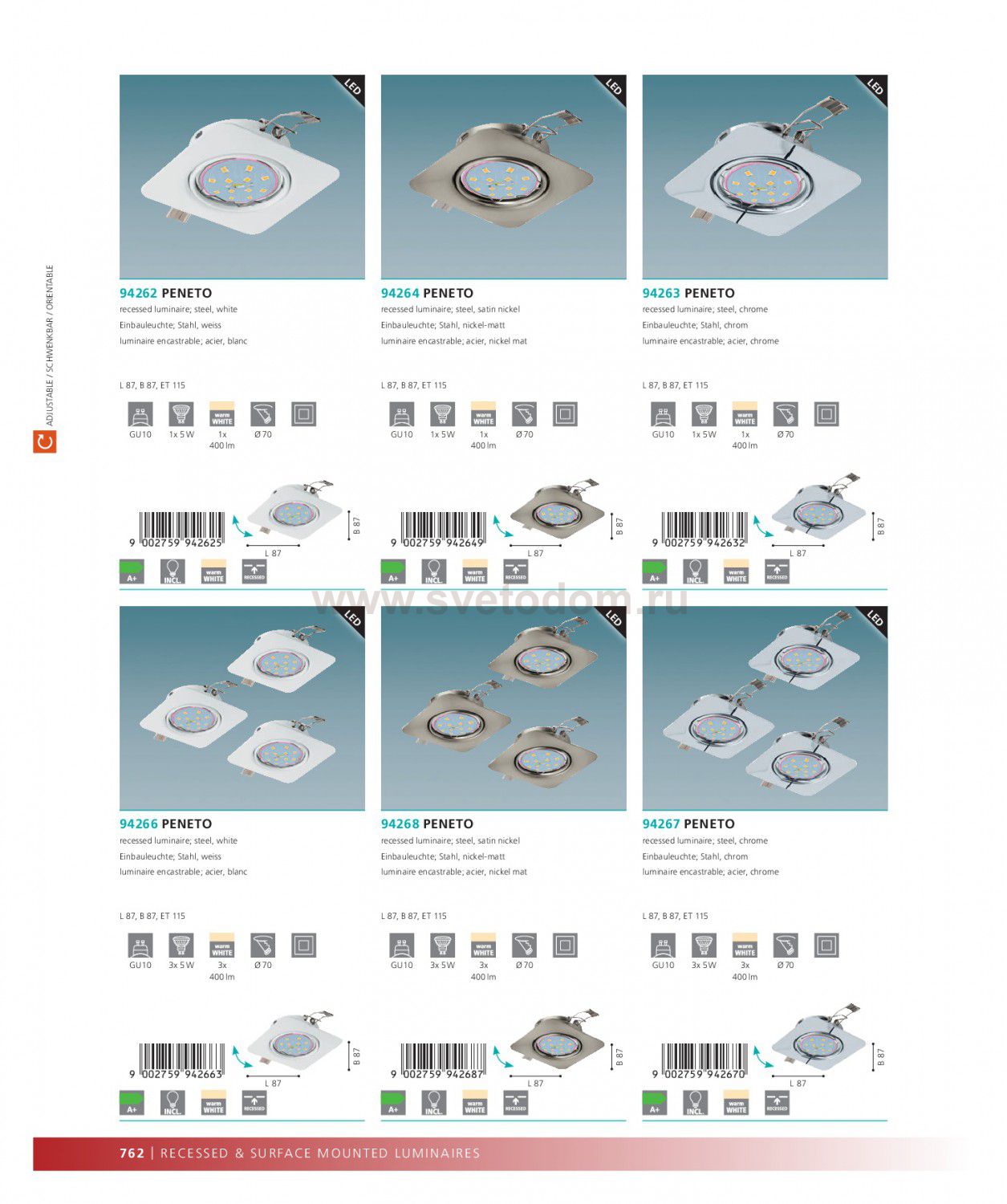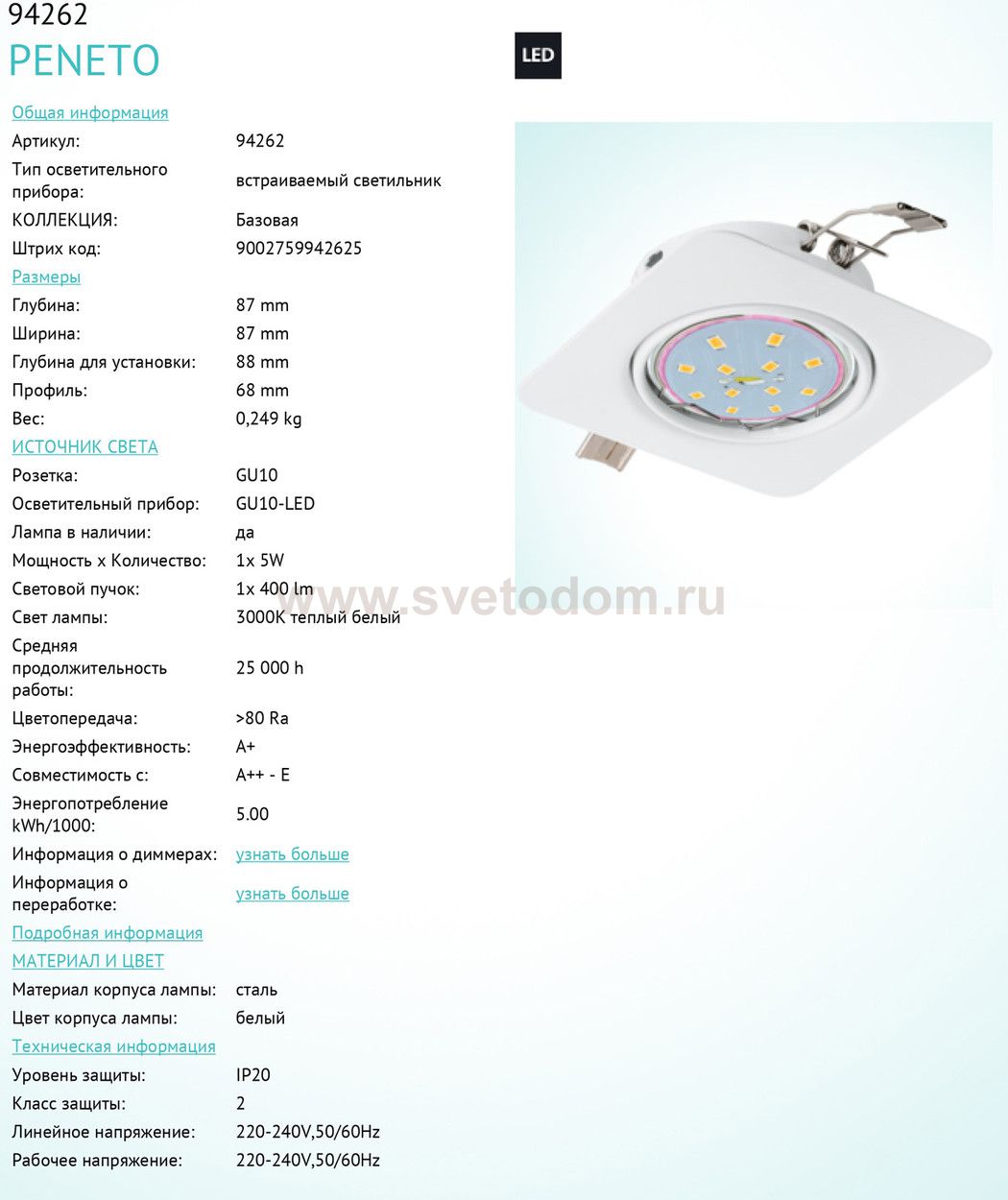 Встраиваемые светильники – популярное осветительное оборудование, которое можно использовать в качестве основного источника или в дополнение к люстре. Они позволяют создать нужную атмосферу атмосферу и привнести в интерьер уют и комфорт. Интернет-магазин «Светодом» предлагает стильный встраиваемый светильник Eglo 94262. Данная модель достаточно универсальна, поэтому подойдет практически под любой интерьер. Перед покупкой не забудьте ознакомиться с техническими параметрами, чтобы узнать тип цоколя, площадь освещения и другие важные характеристики. Приобрести встраиваемый светильник Eglo 94262 в нашем онлайн-магазине Вы можете либо с помощью «Корзины», либо по контактным номерам.