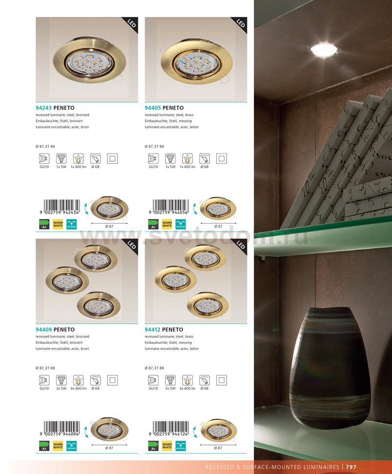 Встраиваемые светильники – популярное осветительное оборудование, которое можно использовать в качестве основного источника или в дополнение к люстре. Они позволяют создать нужную атмосферу атмосферу и привнести в интерьер уют и комфорт. Интернет-магазин «Светодом» предлагает стильный встраиваемый светильник Eglo 94412. Данная модель достаточно универсальна, поэтому подойдет практически под любой интерьер. Перед покупкой не забудьте ознакомиться с техническими параметрами, чтобы узнать тип цоколя, площадь освещения и другие важные характеристики. Приобрести встраиваемый светильник Eglo 94412 в нашем онлайн-магазине Вы можете либо с помощью «Корзины», либо по контактным номерам. Мы развозим заказы по Москве, Екатеринбургу и остальным российским городам.