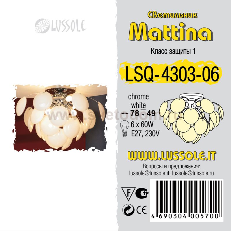 Эта люстра по форме аналогична люстре LUSSOLE LSQ-4303-04 MATTINA, но отличается количеством лампочек – шесть вместо четырех, а, следовательно, большей площадью освещения – до двадцати четырех квадратных метров. Конструкция в виде белого цветка позволяет ей идеально подойти в любой «романтичный» интерьер. Люстра станет украшением вашей комнаты! |