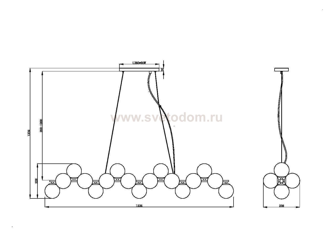 Металлическая арматура в четырех цветах: матовый черный, хром, золото, латунь. Плафоны — выдувное стекло. Цвета — дымчатый, янтарный, коньячный. Дизайн с имитацией молекулярной структуры. Высота подвесных светильников регулируется тросом. Лампа с цоколем G9.