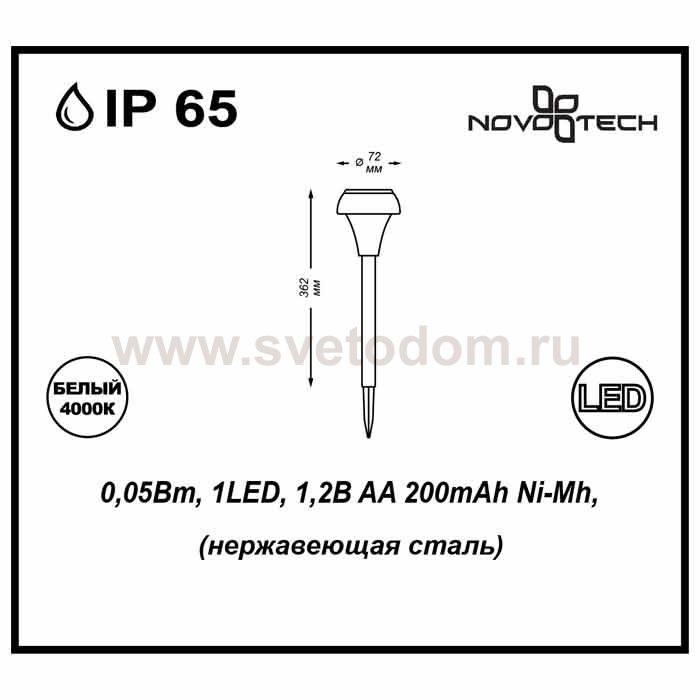 Светильник садовый на солнечных батареях без выключателя модели Novotech 357204 из серии SOLAR отличается следующим качеством: Светильник сделан из нержавеющей стали. Её основное свойство - большой период эксплуатации. Сталь по праву можно считать "вечным" материалом. Так же преимуществами являются устойчивость к химическим, атмосферным и механическим воздействиям и эстетичный внешний вид. Благодаря зеркальной полировке, обеспечивается высокая стойкость металла к коррозии. Безопасность (отсутстствие внешних проводов), простота в установке и многократное перемещение (по необходимости), экологичность, долговечность, прочность, экономичность, эффектность (отличное дополнение любого дома или участка). Срок службы светодиодов - 30000 часов. Время заряда 8 - 10 часов. Время автономной работы - 6 часов. Диапазон рабочих температур от -10 до +50 градусов Цельсия.