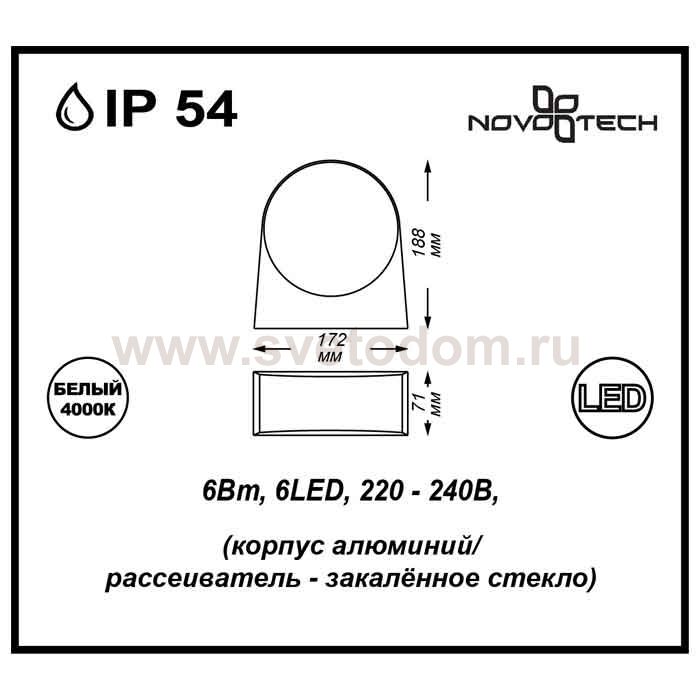 Декоративный светодиодный уличный настенный светильник модели Novotech 357229 из серии SUBMARINE отличается следующим качеством: Корпус светильника сделан из алюминия. Это металл, основными достоинствами которого являются — устойчивость к практически всем видам негативного воздействия окружающей среды, коррозии, небольшой вес, по сравнению с другими видами металла и экологическая безопасность материала. Рассеиватель сделан из закаленного стекла. Оно выдерживает температуру от -70 до 250С., а так же в 5-6 раз прочнее обычного. Экономичность (КПД порядка 90%), отсутствие токсичных элементов (не наносят вред здоровью, не требуют специальной утилизации), отсутствие ультрафиолетового излучения, пожаробезопасность (не нагреваются), морозостойкость, ударопрочность и устойчивость к вибрациям. Срок службы светодиодов до 25000 часов. Диапазон рабочих температур от -20 до +50 градусов Цельсия.