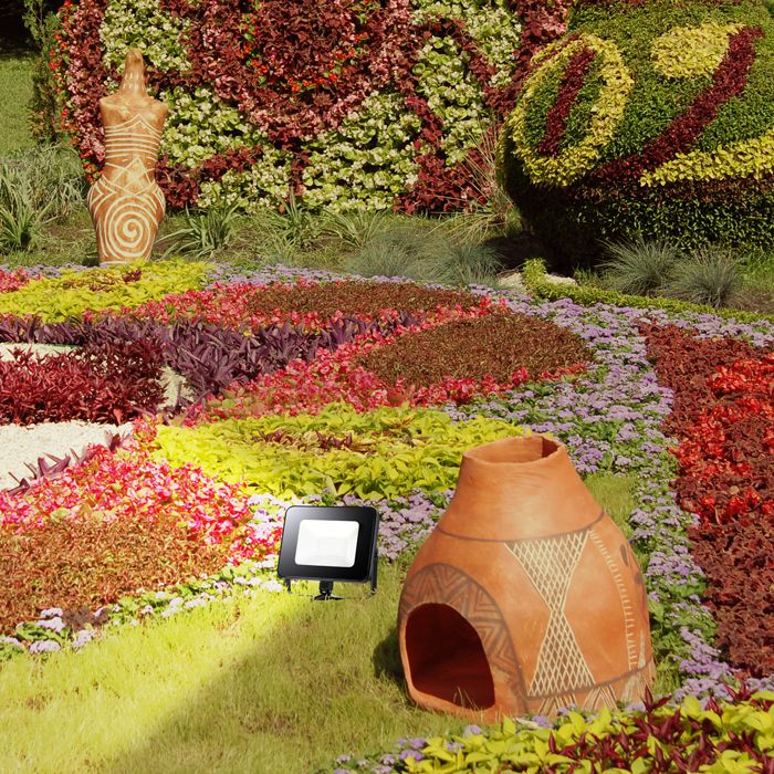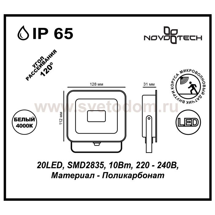Светодиодный прожектор для уличного освещения обеспечивает интенсивную подсветку объекта при низком потреблении электроэнергии. Он надежен, прост в монтаже и удобен в эксплуатации. Оснащен микроволновым датчиком движения - внутри корпуса. Дальность обнаружения движения: Высота: от 1 до 3,5м; Расстояние: от 5 до 8м; Время работы сенсора: 30 секунд; Угол обнаружения движения: 360°.