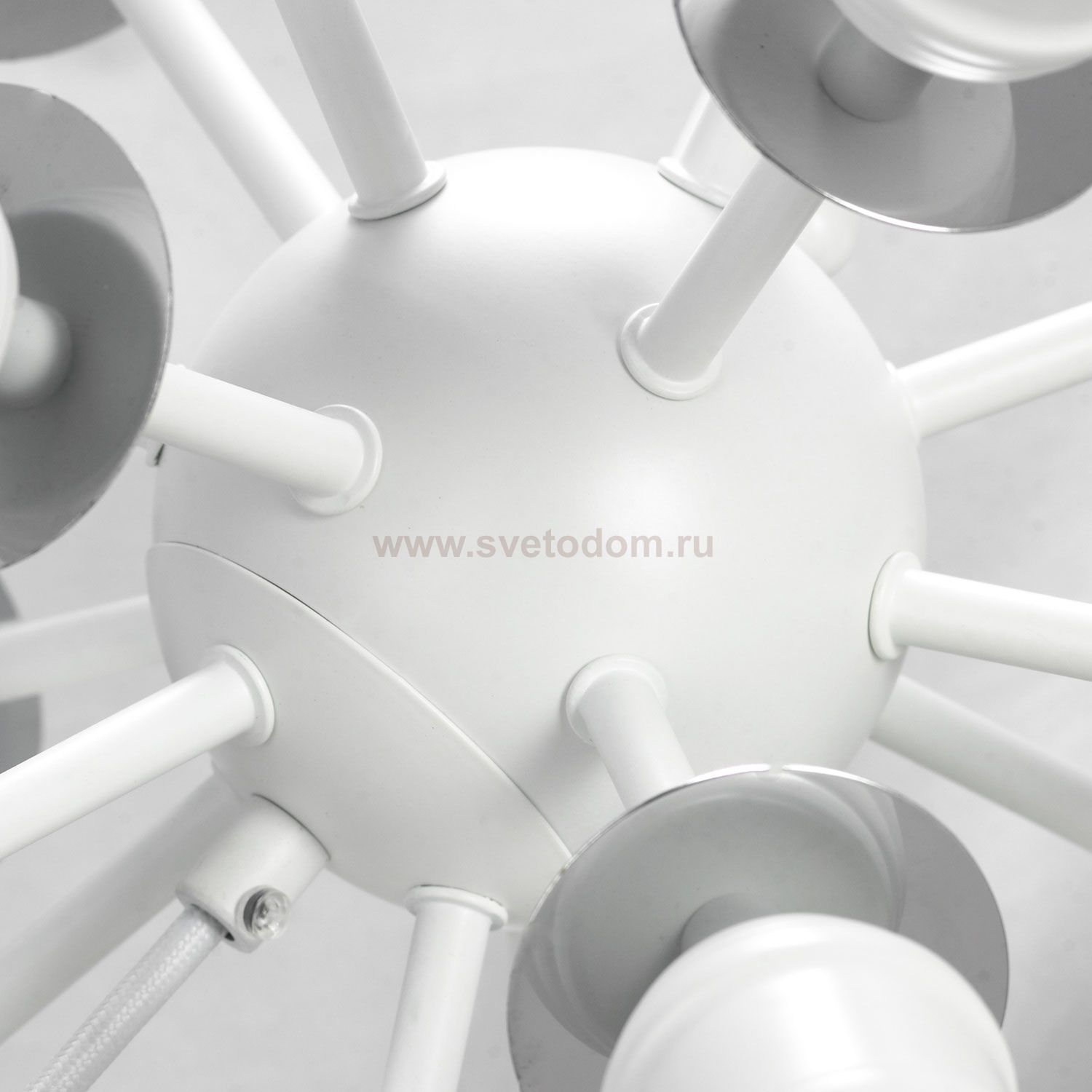 Белая подвесная люстра с направленными в разные стороны излучающими свет лампами украсит коммерческое и жилое помещение. Примененные в конструкции ходовые цоколи Е27 позволят установит в светильник лампы разной формы и стиля. Можно установить белые небольшые шары, а можно и обьемные ретро-лампы.
