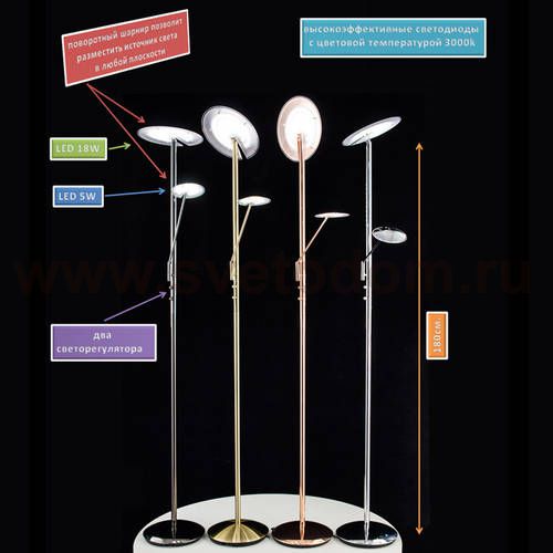 Торшер высотой 180 см с двумя регулируемыми по направлению светодиодными головами, диаметр основания 28см, потолочная голова D=28см с литым корпусом, мощностью18Вт с диммером 20-100%; голова для чтения D=13.5 см с литым корпусом, мощность 5 Вт с диммером Технические особенности