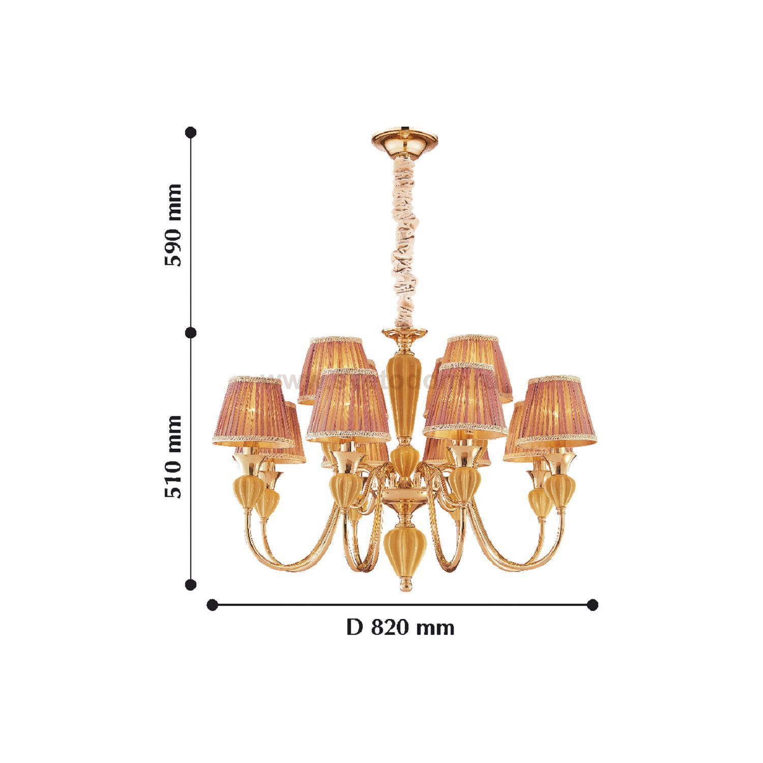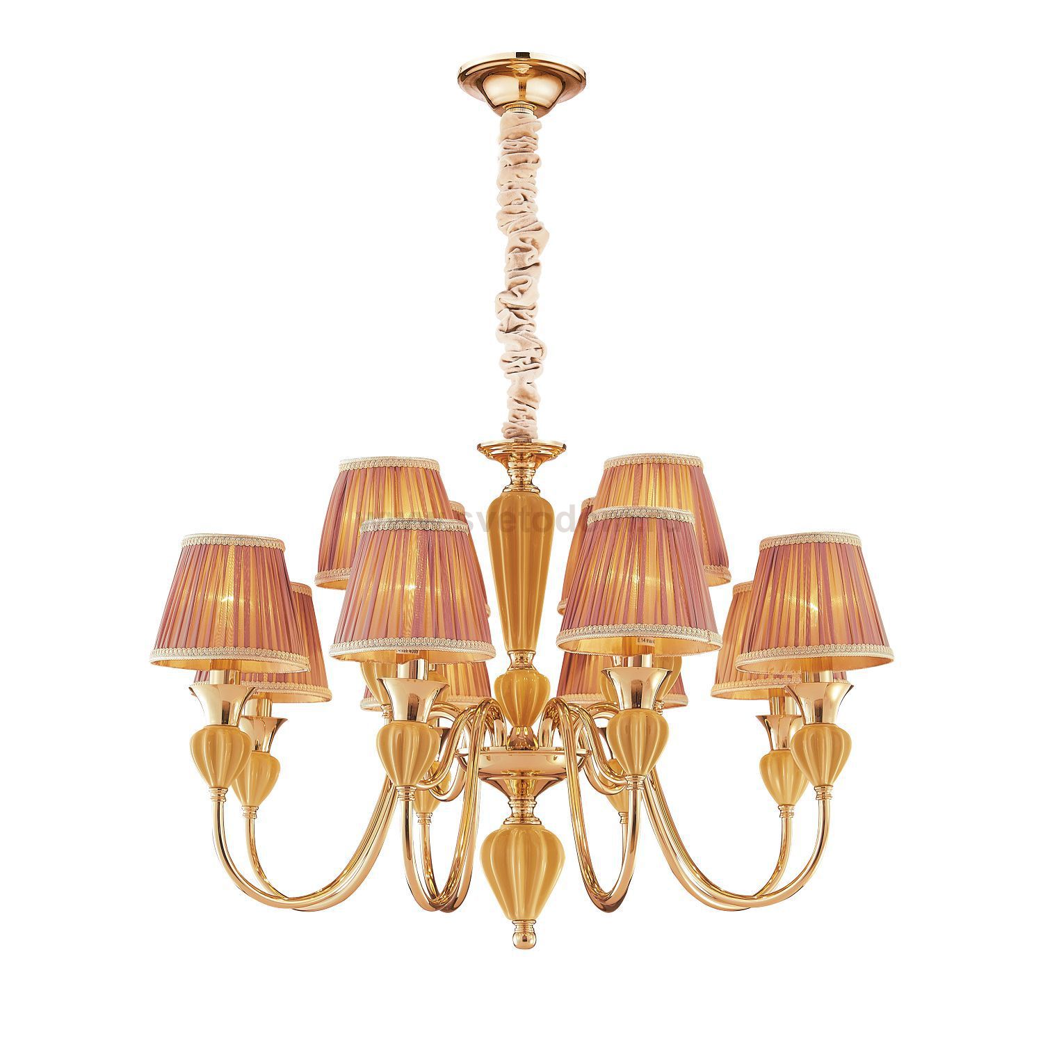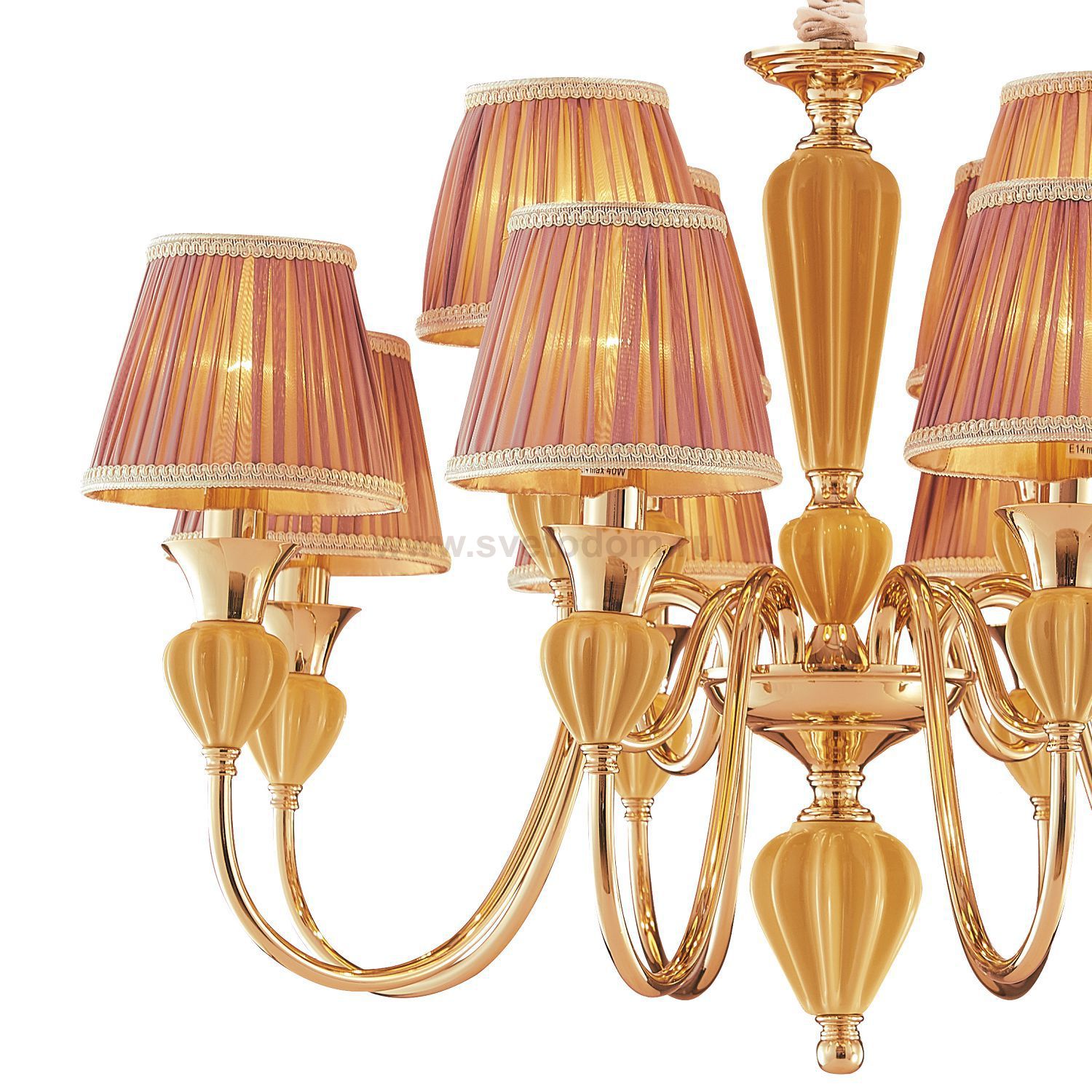 каркас цвета золотой гальваники, декоративные элементы из керамики янтарного цвета, абажуры из пыльно-розовой ткани Комментарий