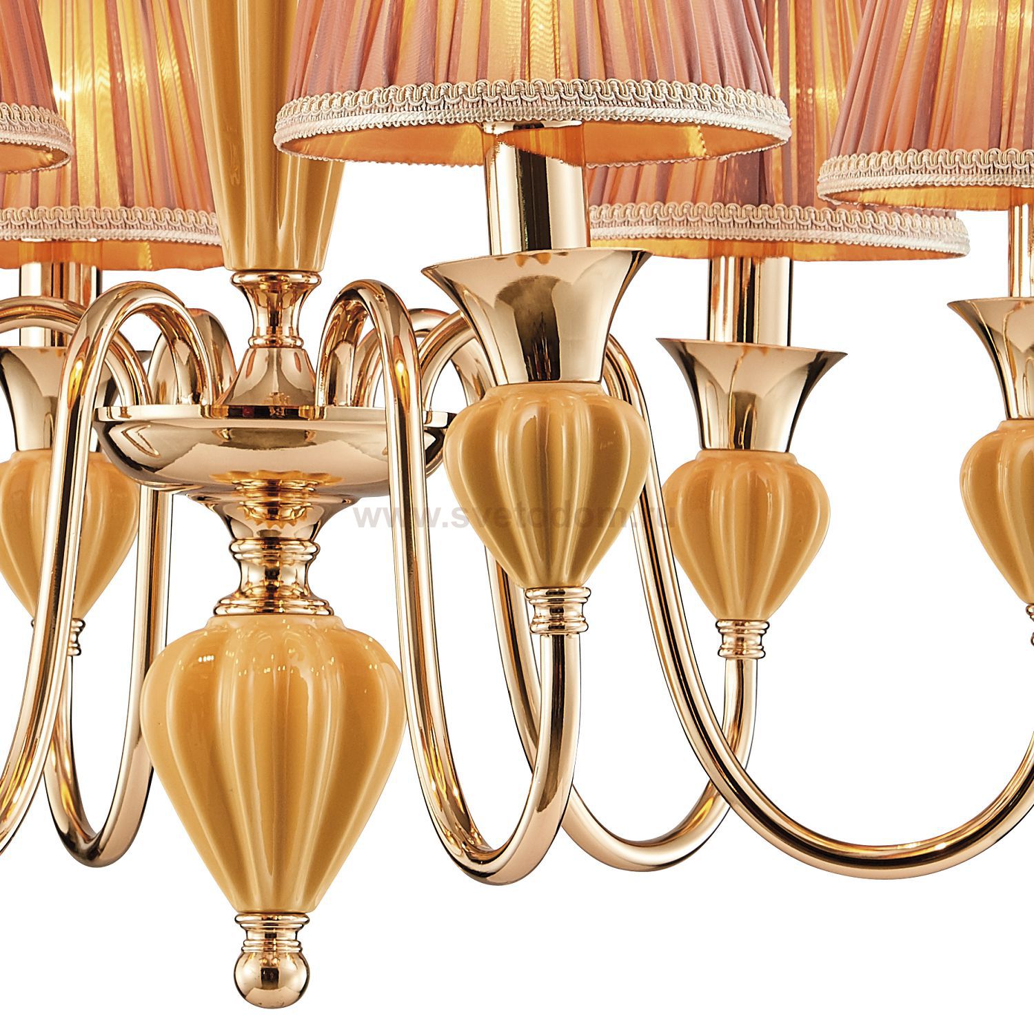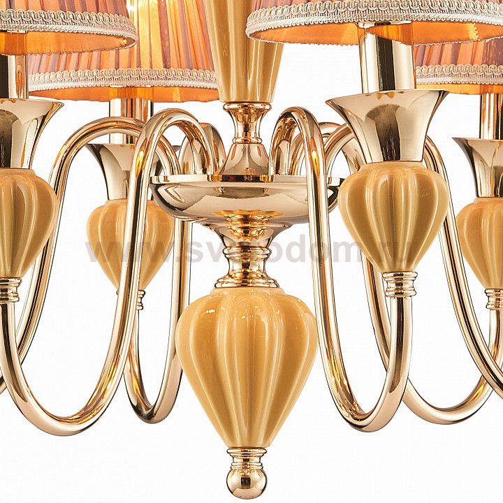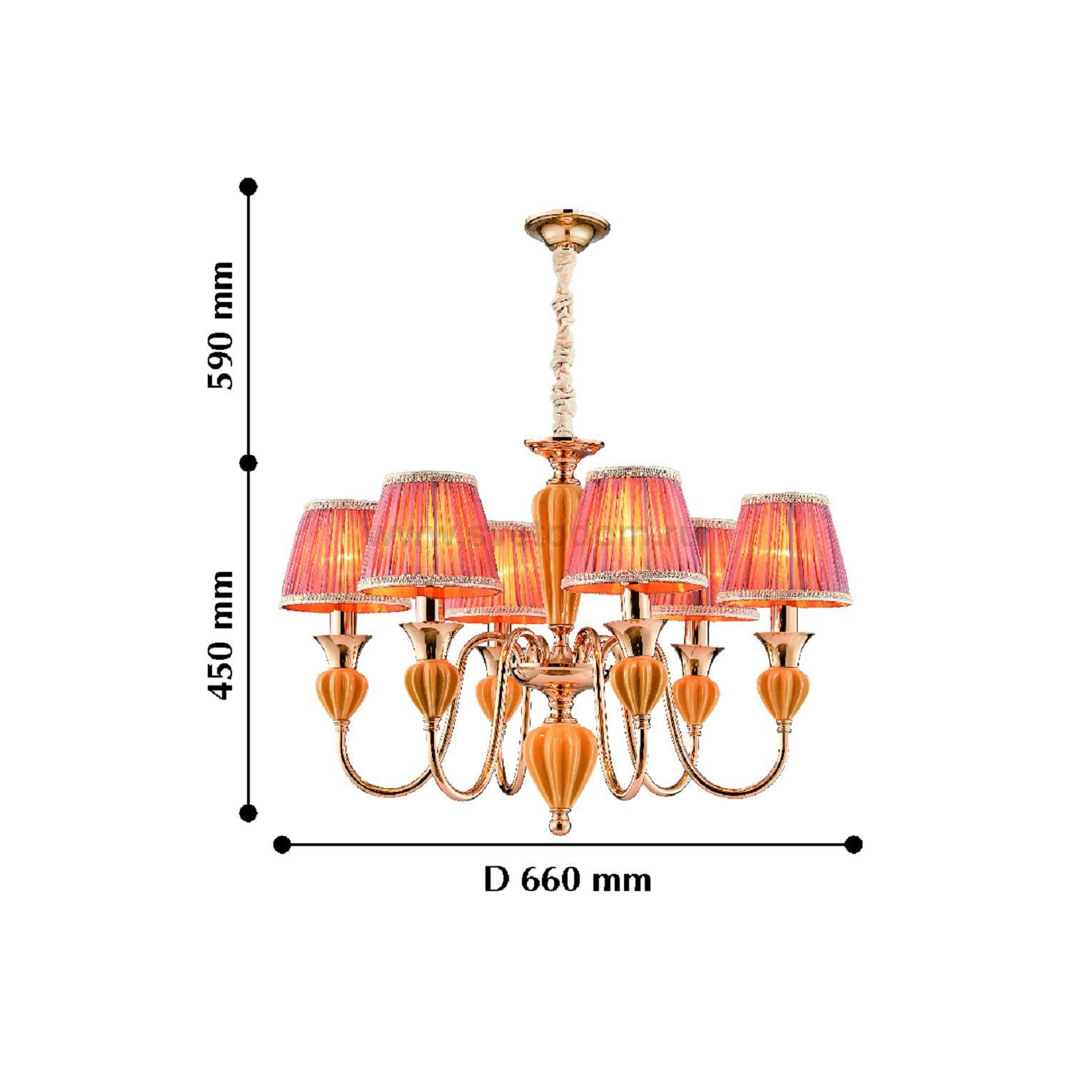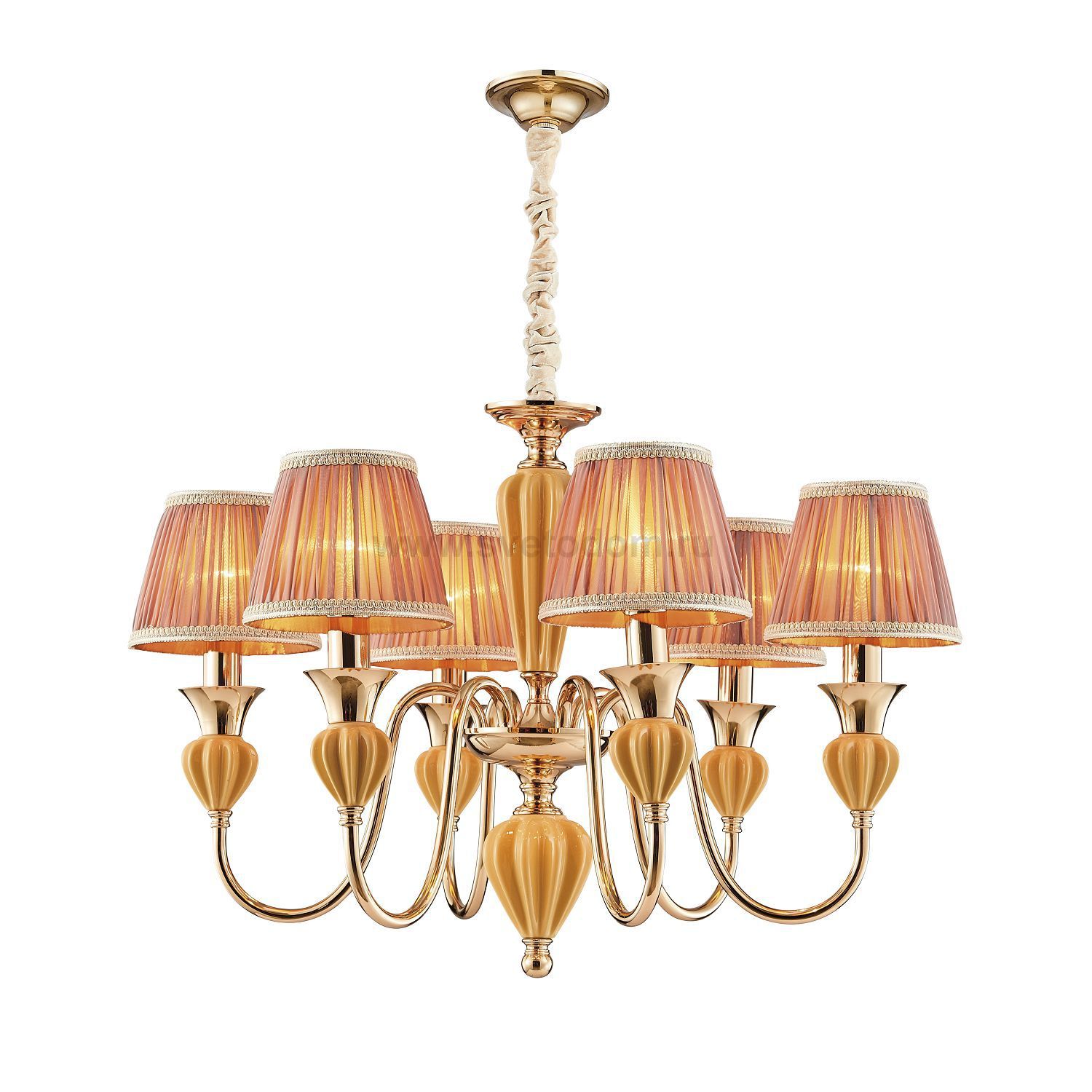каркас цвета золотой гальваники, декоративные элементы из керамики янтарного цвета, абажуры из пыльно-розовой ткани Комментарий