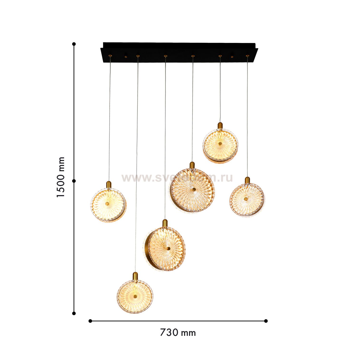Потолочная люстра с черным каркасом, из шести плафонов состоящих из двух узорных стеклянных дисков прозрачного и янтарного цвета, внутри которых распо Серия