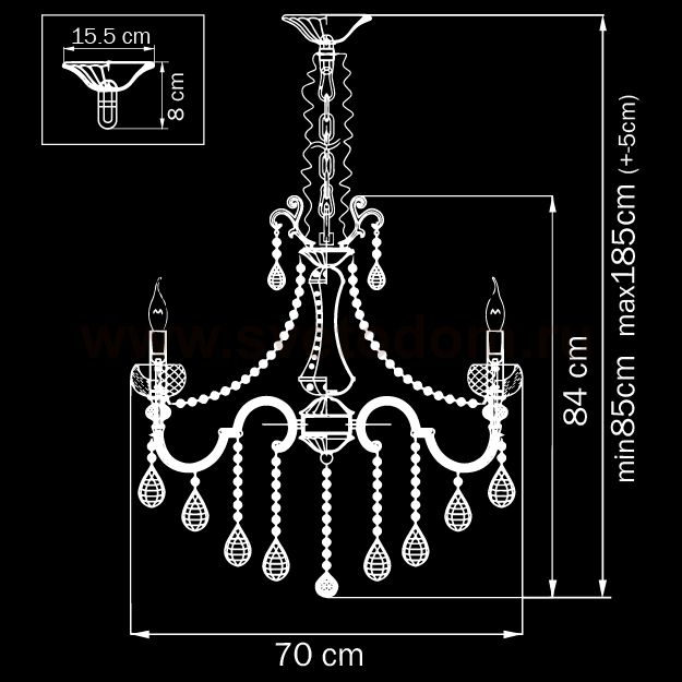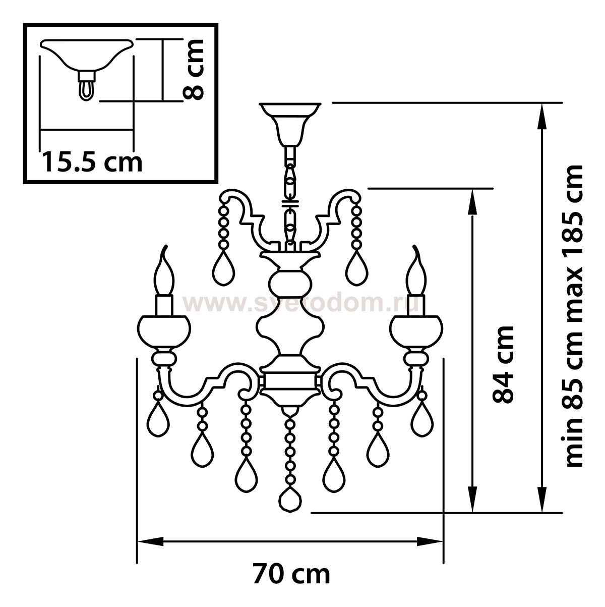 Высота min-max (см): 85-185; Ширина (см): 70; Вес (кг): 18,15; Кол-во ламп: 8xE14; Мощность max (W):60; Цвет основания/цвет стекла или абажура: Gold;