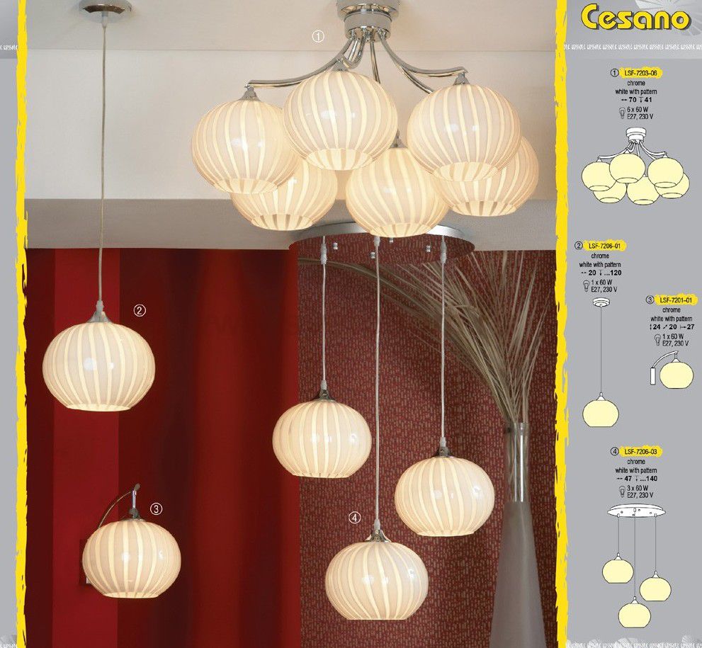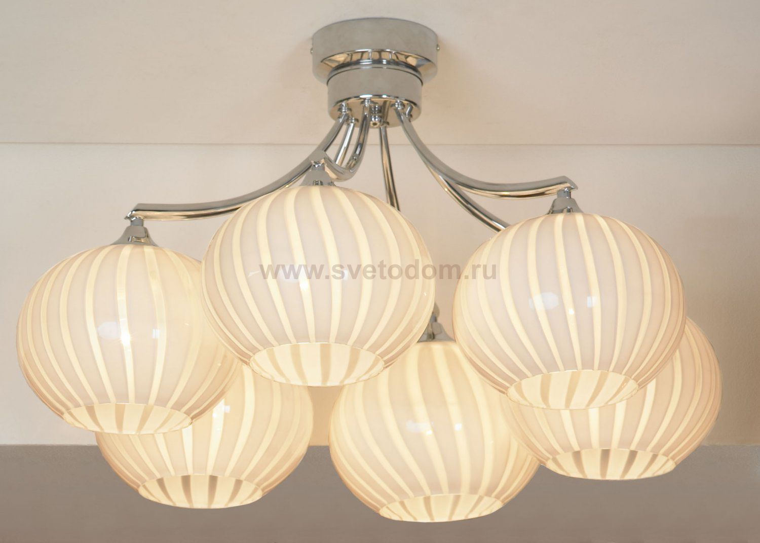 Классическая потолочная люстра с шарообразными полосатыми белыми плафонами. Беспроигрышный дизайн для жилых помещений. Компактный размер Ине повод искать другой вариант, лампы с повышенной светоотдачей исправят ситуацию.