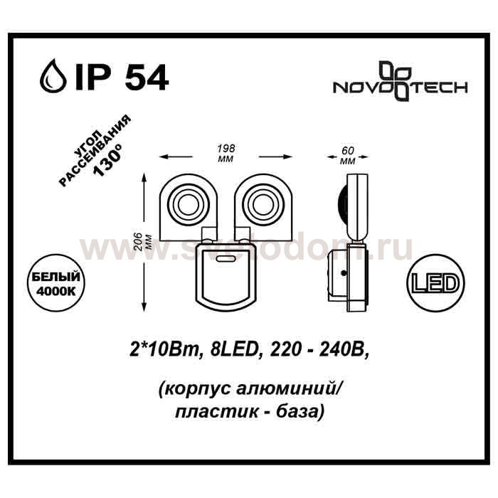 Декоративный светодиодный уличный настенный светильник модели Novotech 357219 из серии TITAN отличается следующим качеством: Корпус светильника состоит из алюминия. Это металл, основными достоинствами которого являются — устойчивость к практически всем видам негативного воздействия окружающей среды, коррозии, небольшой вес, по сравнению с другими видами металла и экологическая безопасность материала. База – пластик. Этот материал имеет высокие эксплуатационные показатели, что объясняется его повышенной стойкостью к механическим повреждениям и защищенностью от факторов внешней среды. Экономичность (КПД порядка 90%), отсутствие токсичных элементов (не наносят вред здоровью, не требуют специальной утилизации), отсутствие ультрафиолетового излучения, пожаробезопасность (не нагреваются), морозостойкость, ударопрочность и устойчивость к вибрациям. Срок службы светодиодов до 25000 часов. Диапазон рабочих температур от -20 до +50 градусов Цельсия.