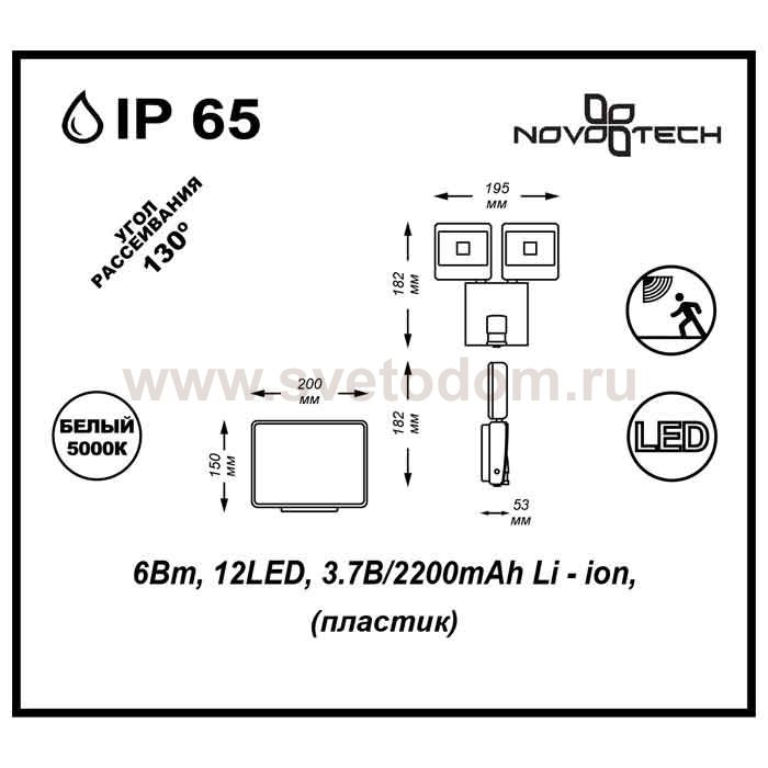 Ландшафтный сенсорный светодиодный светильник на солнечной батарее с датчиком движения модели Novotech 357345 из серии SOLAR отличается следующим качеством: Светильник, сделанный из пластика, имеет высокие эксплуатационные показатели, что объясняется его повышенной стойкостью к механическим повреждениям и защищенностью от факторов внешней среды. Датчик: угол обнаружения max. 130°, дальность обнаружения max. 8м. Время задержки: от 10 ± 5 сек. до 1 мин. (РЕГУЛИРУЕМЫЙ) Срок службы светодиодов - 25000 часов. Время автономной работы после полной зарядки батареи - 60 мин. После 1го дня зарядки батареи - 20 мин. . Диапазон рабочих температур от -20 до +40 градусов Цельсия.