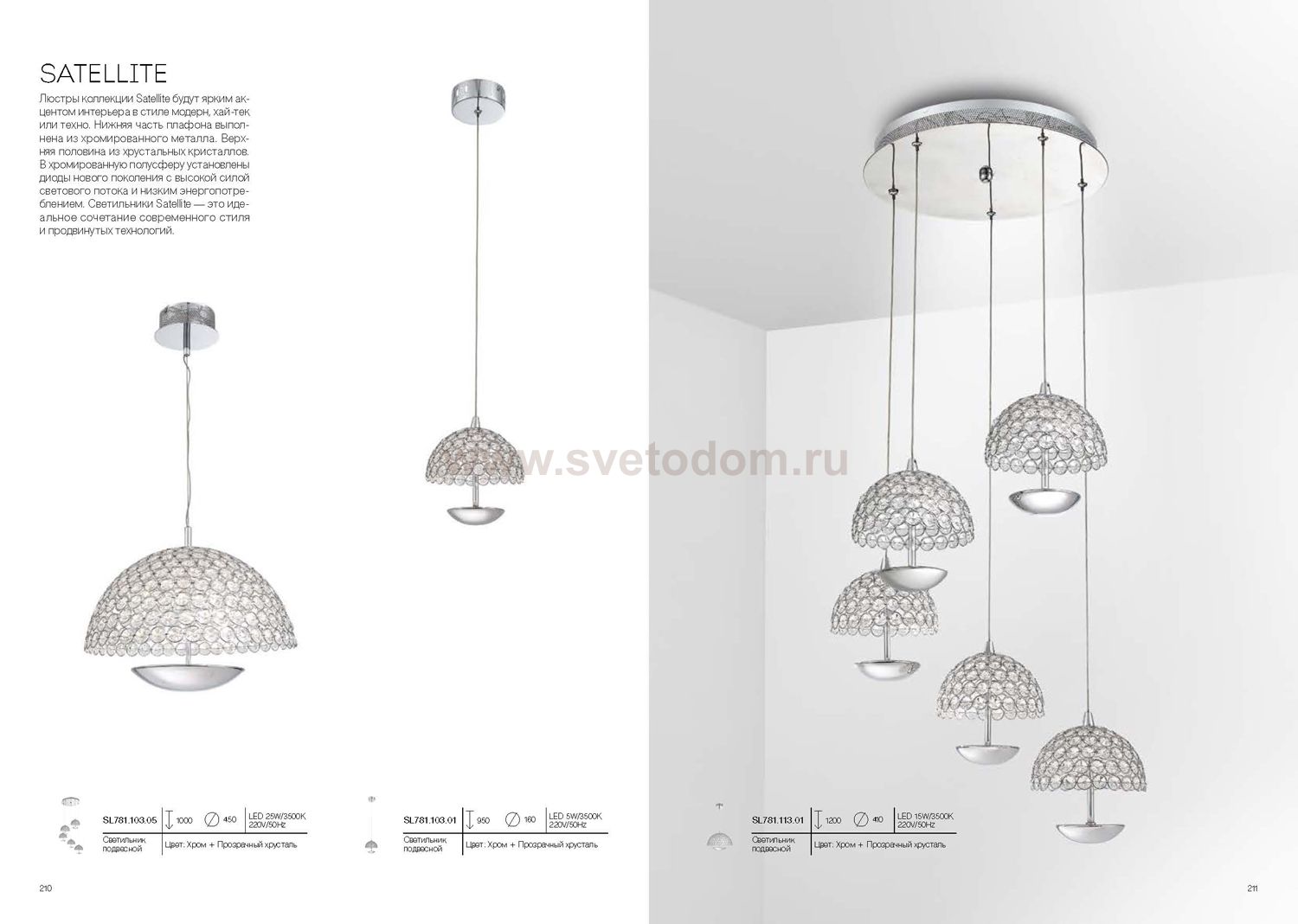 Касаемо коллекции модели St luce SL781.113.01 хотелось бы отметить основные моменты: Люстры коллекции Satellite будут ярким акцентом интерьера в стиле модерн, хай-тек или техно. Нижняя часть плафона выполнена из хромированного металла. Верхняя половина из хрустальных кристаллов. В хромированную полусферу установлены диоды нового поколения с высокой силой светового потока и низким энергопотреблением. Светильники Satellite - это идеальное сочетание современного стиля и продвинутых технологий.