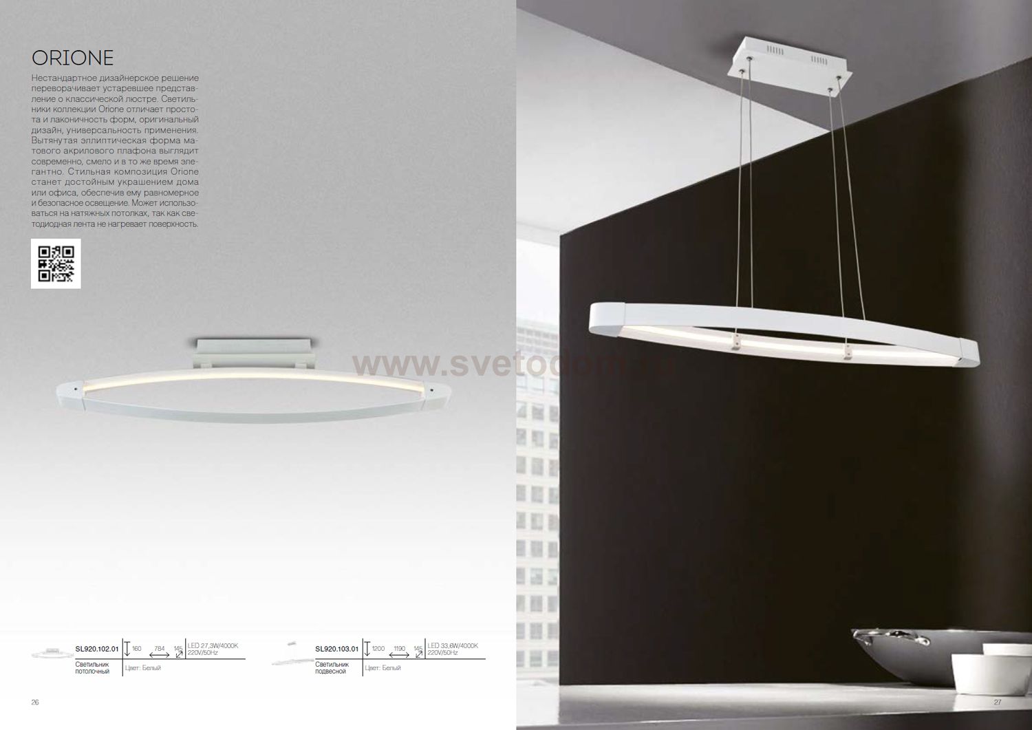 Если Вы настроены купить светильник модели SL92010301, то обратите внимание: Нестандартное дизайнерское решение переворачивает устаревшие представления о классической люстре. Светильники коллекции Orione отличает простота и лаконичность форм, оригинальный дизайн, универсальность применения. Вытянутая элиптическая форма матового акрилового плафона выглядит современно, смело и в то же время, элегантно. Стильная композиция Orione станет достойным украшением дома или офиса, обеспечив ему равномерное и безопасное освещение. Может использоваться на натяжных потолках, так как светодиодная лента не нагревает поверхность.