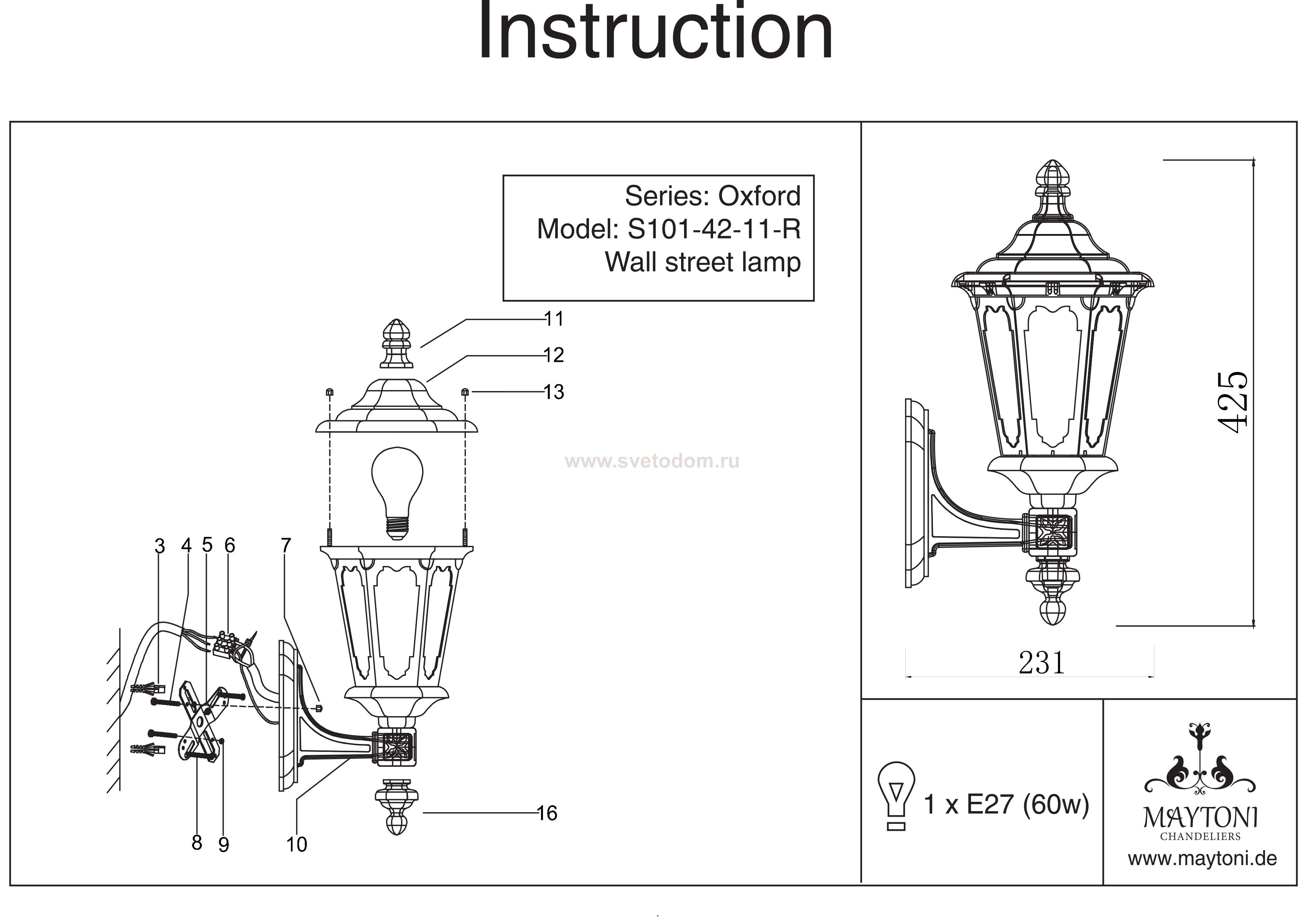 Корпус из металла, устойчивый к перепадам температуры. Плафон из прозрачного стекла. Комментарий