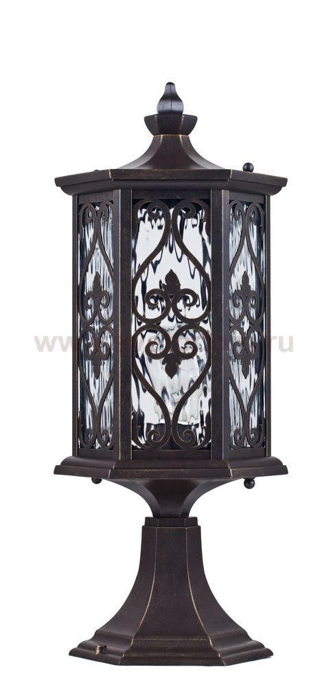 Корпус из металла, устойчивый к перепадам температуры. Покрытие бронзового цвета. Плафон из прозрачного стекла. Дополнительно