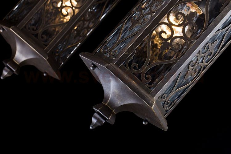 Корпус из металла, устойчивый к перепадам температуры. Покрытие бронзового цвета. Плафон из прозрачного стекла. Дополнительно