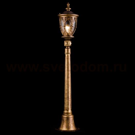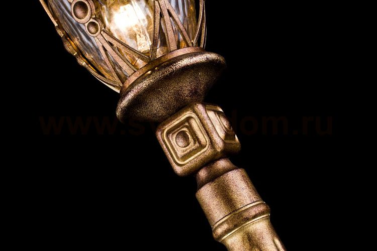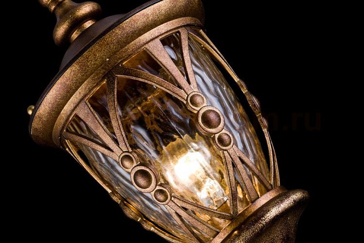 Корпус из металла устойчивый к перепадам температуры. Покрытие необычного цвета «античного золота» и черного. Плафон из прозрачного фактурного стекла. Дополнительно