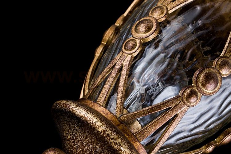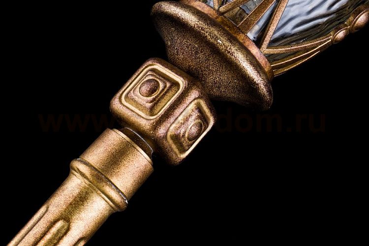 Корпус из металла устойчивый к перепадам температуры. Покрытие необычного цвета «античного золота» и черного. Плафон из прозрачного фактурного стекла. Дополнительно