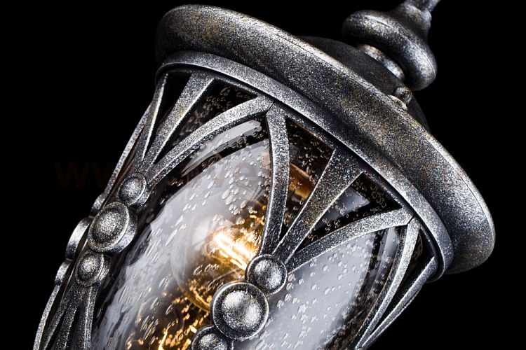 Корпус из металла устойчивый к перепадам температуры. Покрытие необычного цвета «античного золота» и черного. Плафон из прозрачного фактурного стекла. Дополнительно