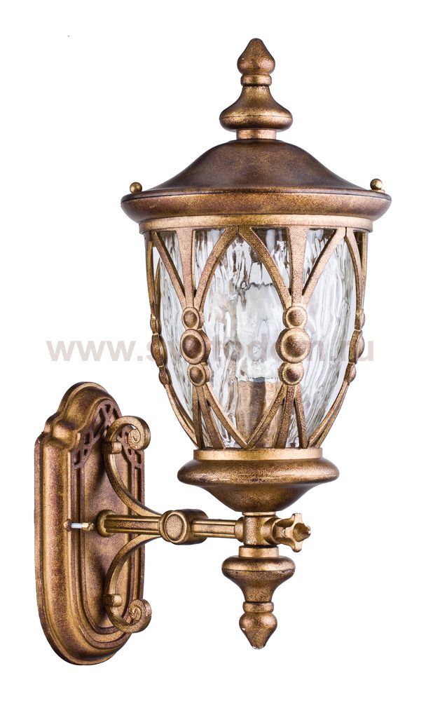 Корпус из металла устойчивый к перепадам температуры. Покрытие необычного цвета «античного золота» и черного. Плафон из прозрачного фактурного стекла. Дополнительно