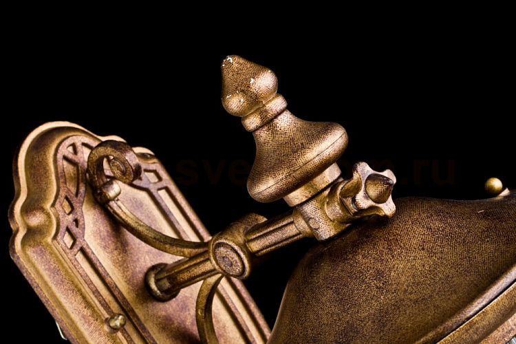 Корпус из металла устойчивый к перепадам температуры. Покрытие необычного цвета «античного золота» и черного. Плафон из прозрачного фактурного стекла. Дополнительно