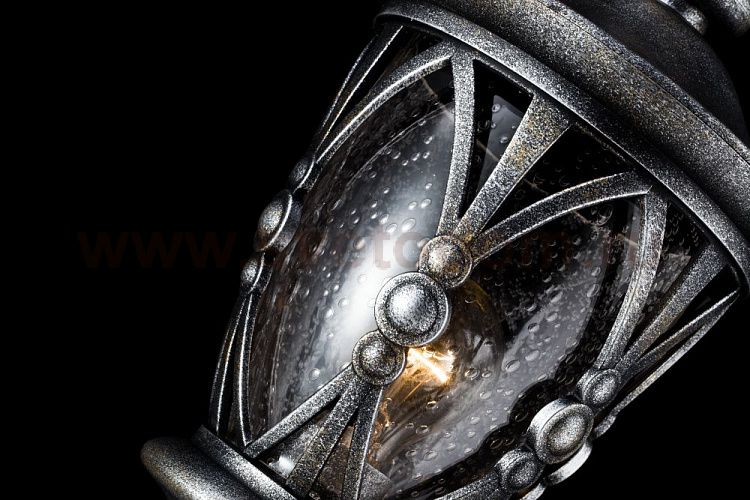 Корпус из металла устойчивый к перепадам температуры. Покрытие необычного цвета «античного золота» и черного. Плафон из прозрачного фактурного стекла. Дополнительно