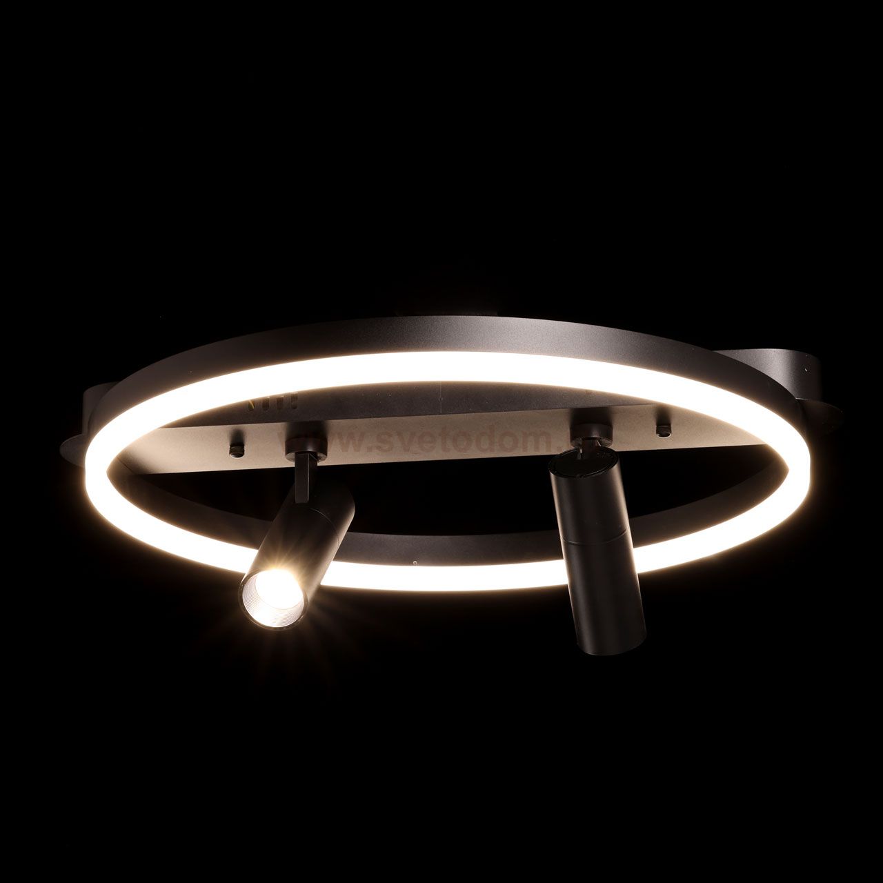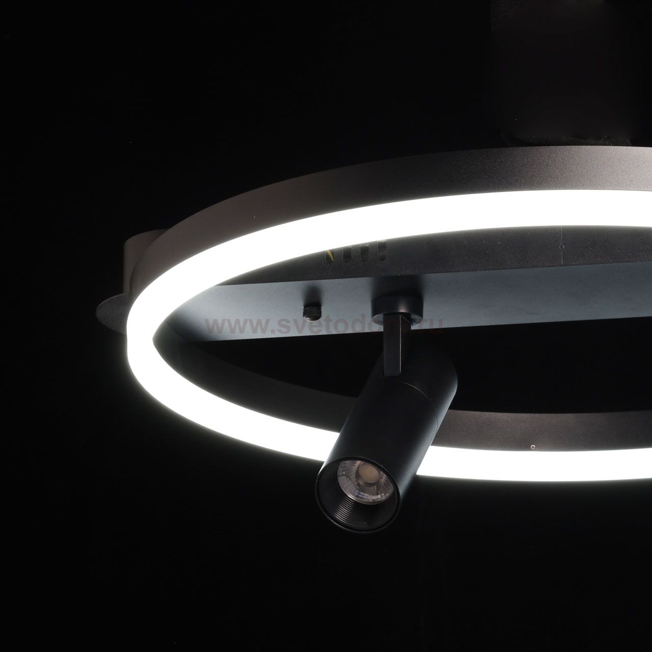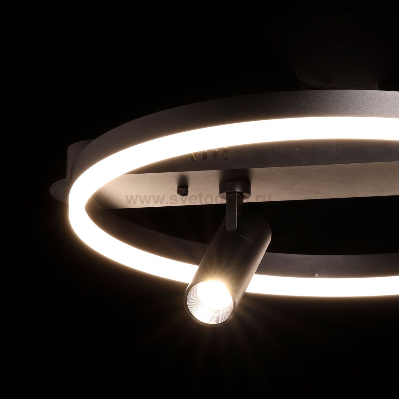 Металлическое основание потолочной люстры окрашено в черный цвет. Корпус плафона выполнен из сплава алюминия и окрашен в цвет основания. Светодиодный источник света закрыт матовым акрилом. Комментарий