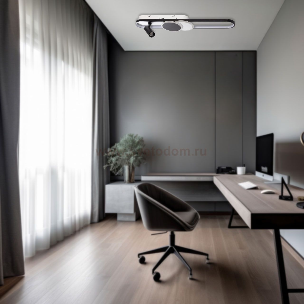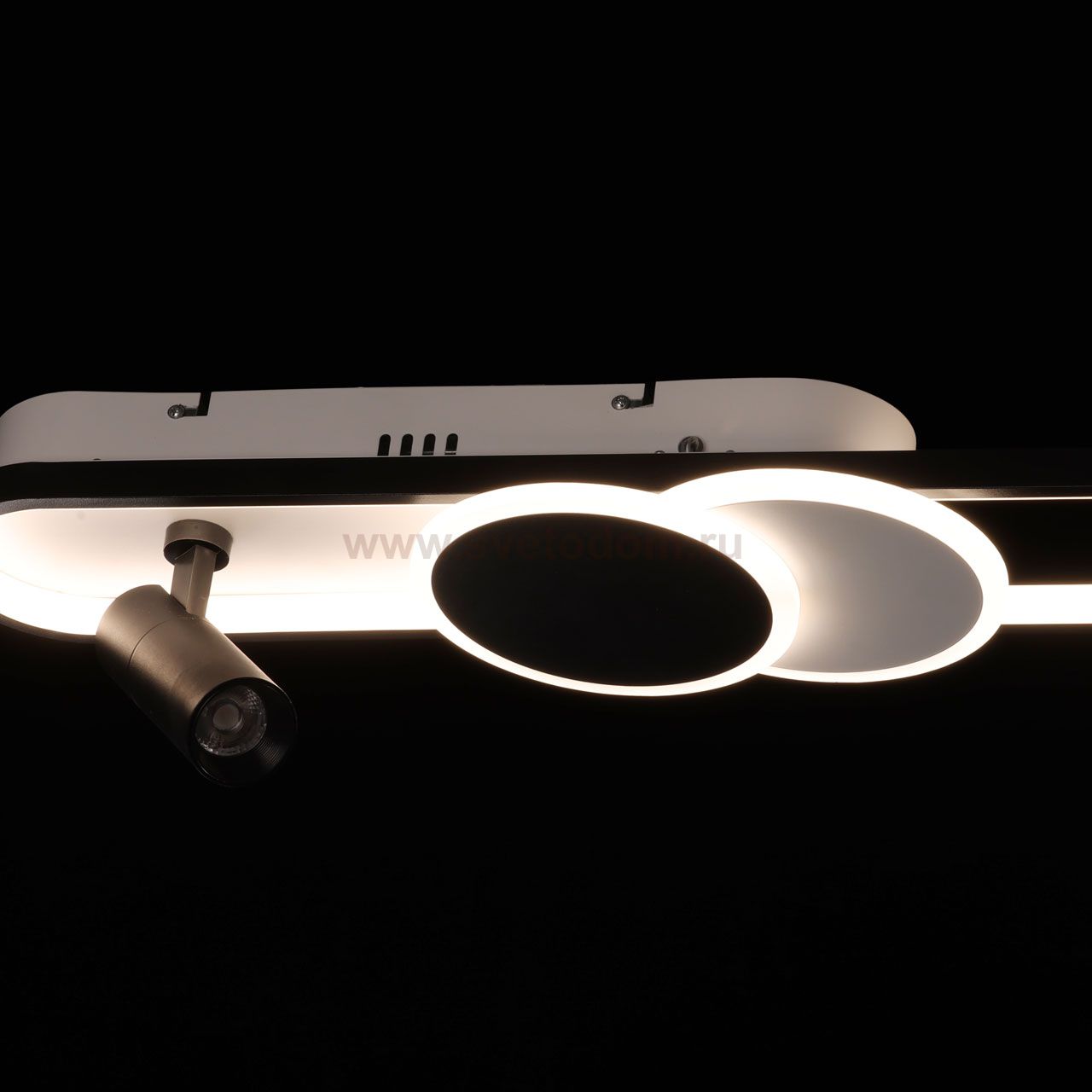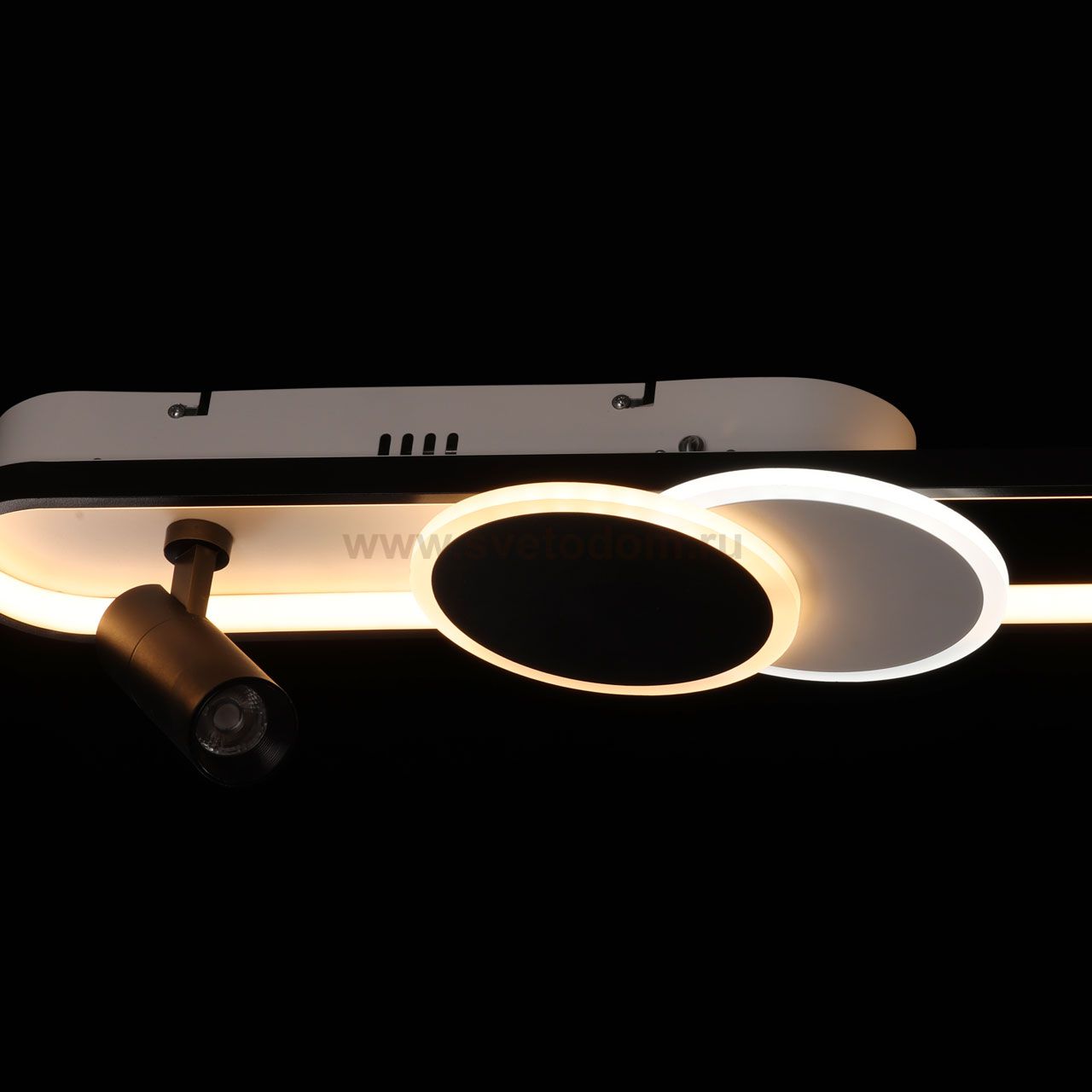 Металлическое основание потолочной люстры окрашено в белый цвет. Корпус плафона выполнен из сплава алюминия с цинком и окрашен в черный цвет. Светодиодный источник света закрыт матовым акрилом. Комментарий