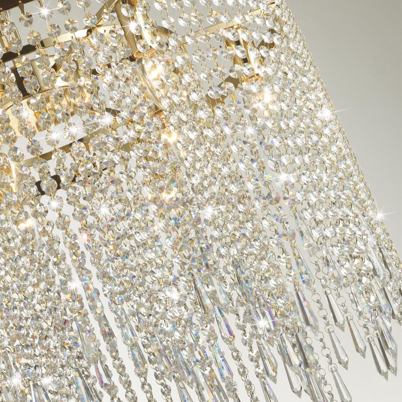 Chokka — великолепная широкая линейка моделей в неоклассическом стиле . 10 различных светильников – 3 вида бра, 2 вида подвесов, 3 вида люстр, торшер, настольная лампа - из одной серии способны создать шикарный ансамбль из современный хрустальных светильников и осветить несколько помещений, создавая единую световую концепцию. Множество хрустальных длинных подвесок с элегантным пирамидальным завершающим элементом каждой создают невероятный целостный абажур из переливающихся и струящихся нитей.