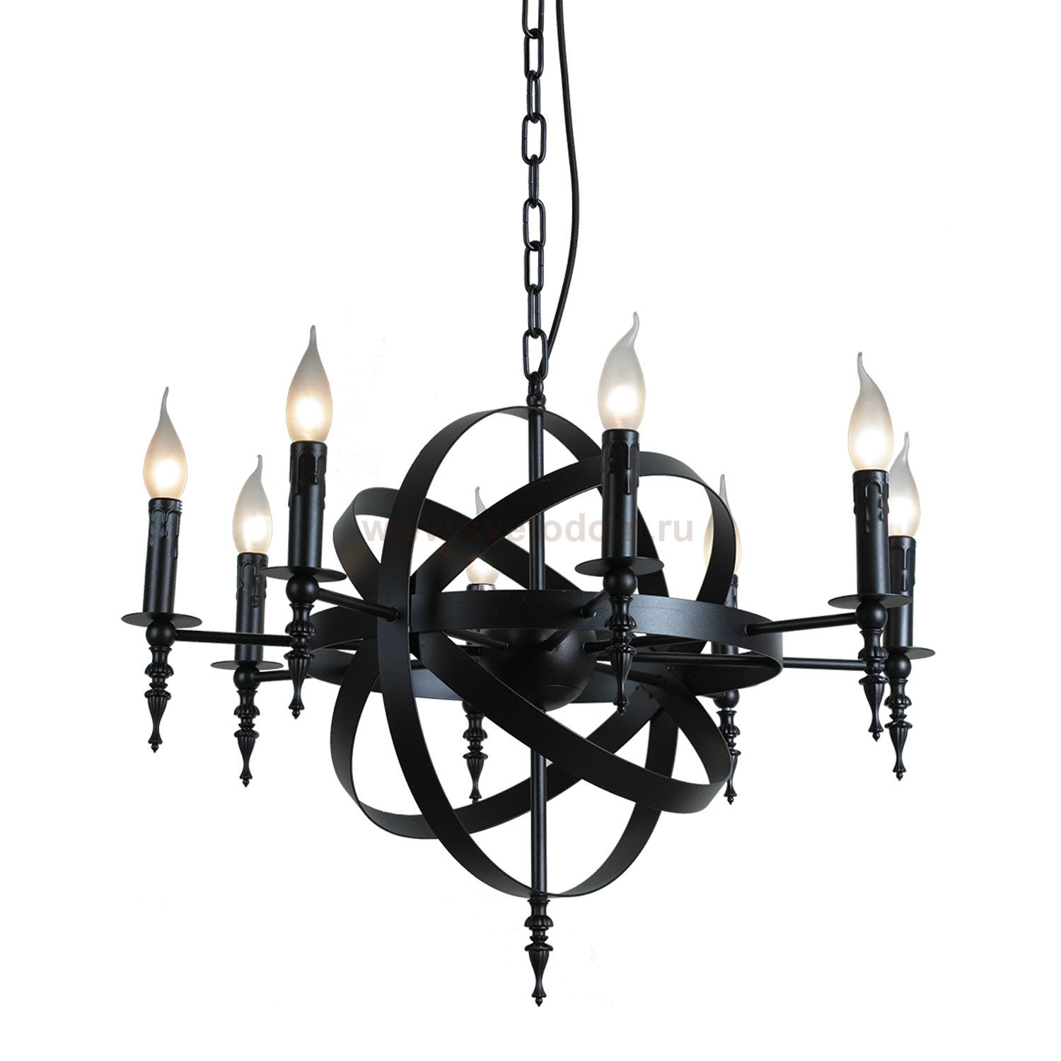 Черная объемная подвесная люстра в замковом стиле, с восемью свечами хорошо впишется в средневековые интерьеры. Применение ретро ламп или теплых светодиодных ламп подарит ощущение горящих свечей.