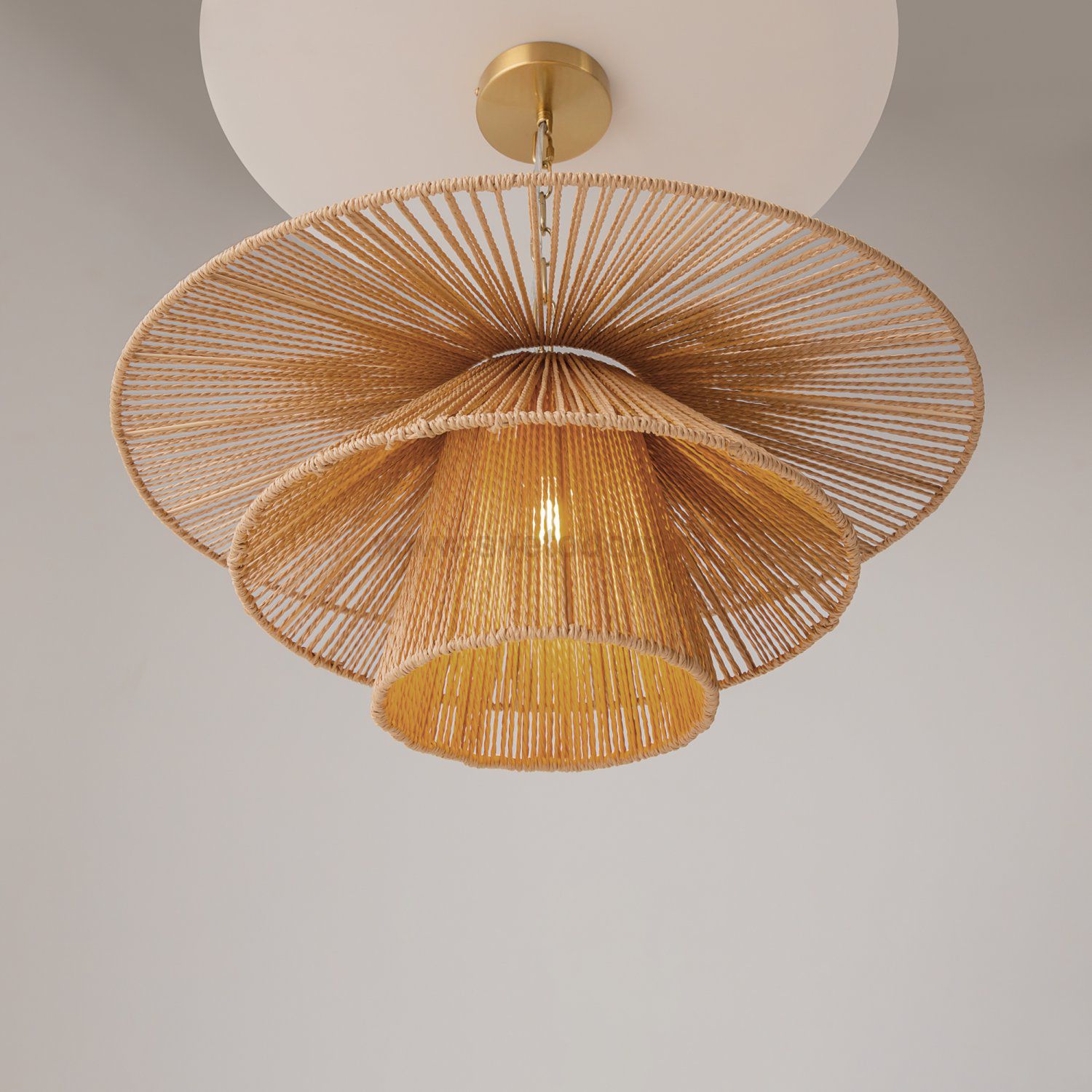 Материал абажура — натуральный ротанг. Металлическая арматура в цвете латуни. Две формы абажуров. Металлическая цепь в цвете латунь длиной 3 метра, подходит для помещений с высокими потолками. Эко-дизайн, вдохновленный дикими пляжами Индийского океана. Сменный источник света.