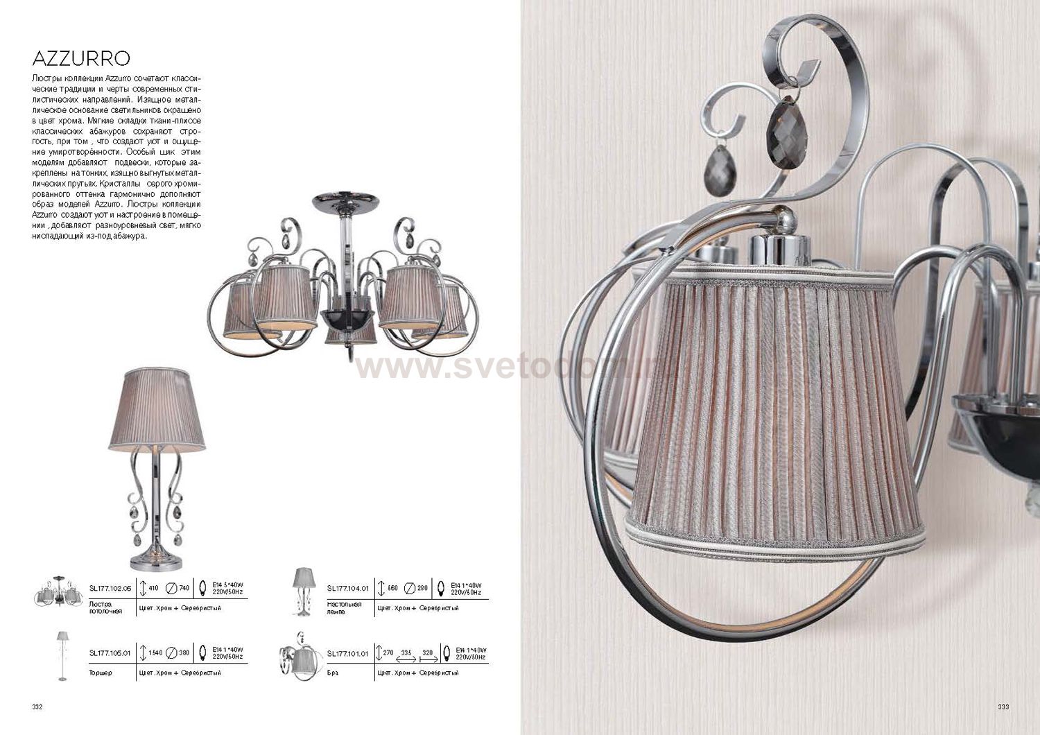 Если Вы настроены купить светильник модели SL17710501, то обратите внимание: Люстры коллекции Azzurroсочетают классические традиции и черты современных стилистических направлений. Изящное металлическое основание светильников окрашено в цвет хрома. Мягкие складки ткани-плиссе классических абажуров сохраняют строгость, при том , что создают уют и ощущение умиротворённости. Особый шик этим моделям добавляют подвески, которые закреплены на тонких, изящно выгнутых металлических прутьях. Кристаллы серого хромированного оттенка гармонично дополняют образ моделей Azzurro. Люстры коллекции Azzurro создают уют и настроение в помещении , добавляют разноуровневый свет, мягко ниспадающий из-под абажура.