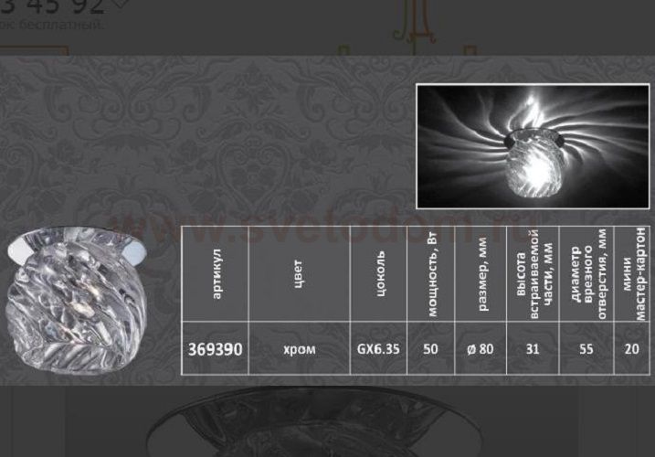 Встраиваемые светильники – популярное осветительное оборудование, которое можно использовать в качестве основного источника или в дополнение к люстре. Они позволяют создать нужную атмосферу атмосферу и привнести в интерьер уют и комфорт. Интернет-магазин «Светодом» предлагает стильный встраиваемый светильник Novotech 369390. Данная модель достаточно универсальна, поэтому подойдет практически под любой интерьер. Перед покупкой не забудьте ознакомиться с техническими параметрами, чтобы узнать тип цоколя, площадь освещения и другие важные характеристики. Приобрести встраиваемый светильник Novotech 369390 в нашем онлайн-магазине Вы можете либо с помощью «Корзины», либо по контактным номерам. Мы развозим заказы по Москве, Екатеринбургу и остальным российским городам.