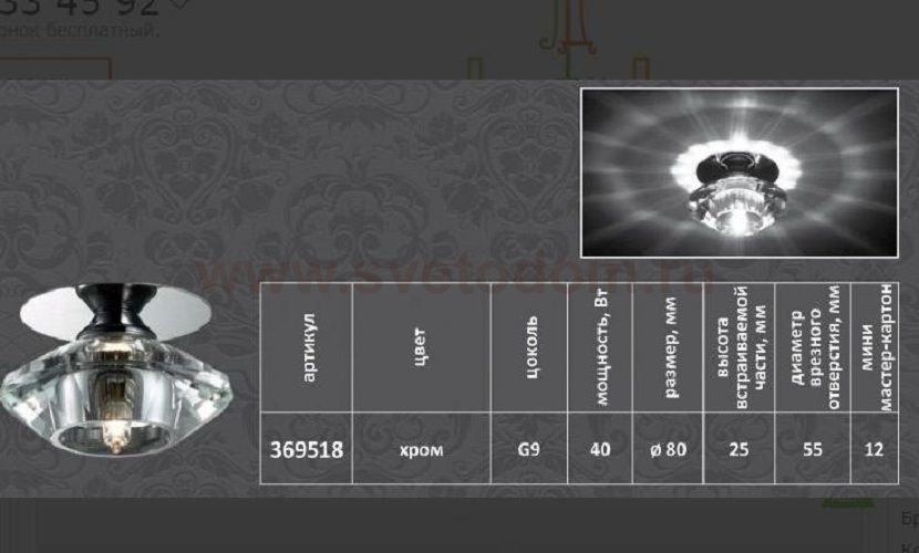 Встраиваемые светильники – популярное осветительное оборудование, которое можно использовать в качестве основного источника или в дополнение к люстре. Они позволяют создать нужную атмосферу атмосферу и привнести в интерьер уют и комфорт. Интернет-магазин «Светодом» предлагает стильный встраиваемый светильник Novotech 369518. Данная модель достаточно универсальна, поэтому подойдет практически под любой интерьер. Перед покупкой не забудьте ознакомиться с техническими параметрами, чтобы узнать тип цоколя, площадь освещения и другие важные характеристики. Приобрести встраиваемый светильник Novotech 369518 в нашем онлайн-магазине Вы можете либо с помощью «Корзины», либо по контактным номерам. Мы развозим заказы по Москве, Екатеринбургу и остальным российским городам.