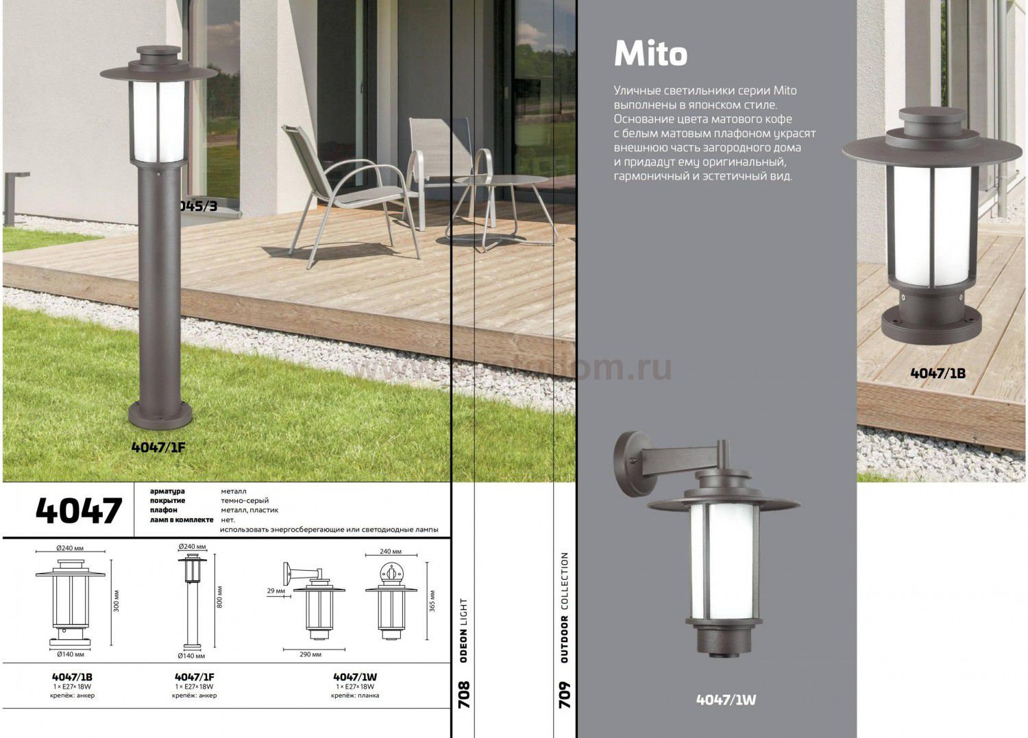 Уличный светильник 4047/1F линии Mito выполнен в японском стиле. Основание цвета матового кофе с белым матовым плафоном украсят внешнюю часть загородного дома и придадут ему оригинальный, гармоничный и эстетичный вид. Цоколь E27. Мощность 1*18W. Нет ламп в комплекте.