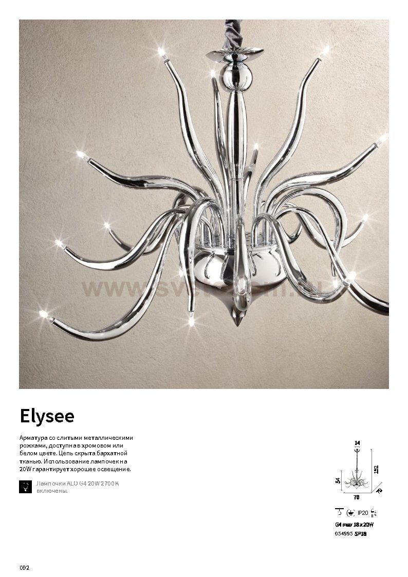 Компания «Светодом» предлагает широкий ассортимент люстр от известных производителей. Представленные в нашем каталоге товары выполнены из современных материалов и обладают отличным качеством. Благодаря широкому ассортименту Вы сможете найти у нас люстру под любой интерьер. Мы предлагаем как классические варианты, так и современные модели, отличающиеся лаконичностью и простотой форм. Стильная люстра Ideal lux ELYSEE SP18 CROMO станет украшением любого дома. Эта модель от известного производителя не оставит равнодушным ценителей красивых и оригинальных предметов интерьера. Люстра Ideal lux ELYSEE SP18 CROMO обеспечит равномерное распределение света по всей комнате. При выборе обратите внимание на характеристики, позволяющие приобрести наиболее подходящую модель. Купить понравившуюся люстру по доступной цене Вы можете в интернет-магазине «Светодом».