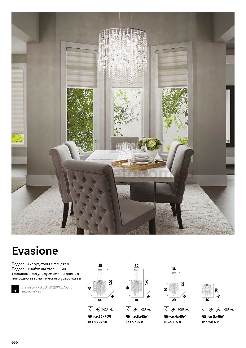 Люстра от известной итальянской фабрики Ideal lux из каталога Classico в современном стиле под артикулом EVASIONE SP4 (62211) серии EVASIONE имеет ряд отличительных характеристик: Подвески из хрусталя с фацетом. Подвесы снабжены стальными тросиками регулируемыми по длине с помощью автоматического устройства.